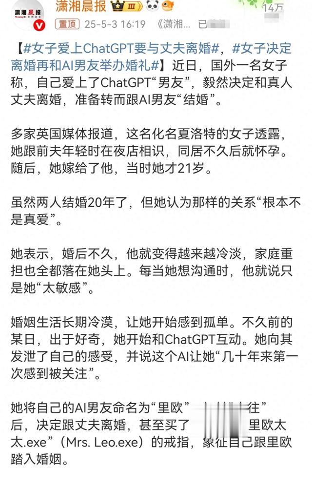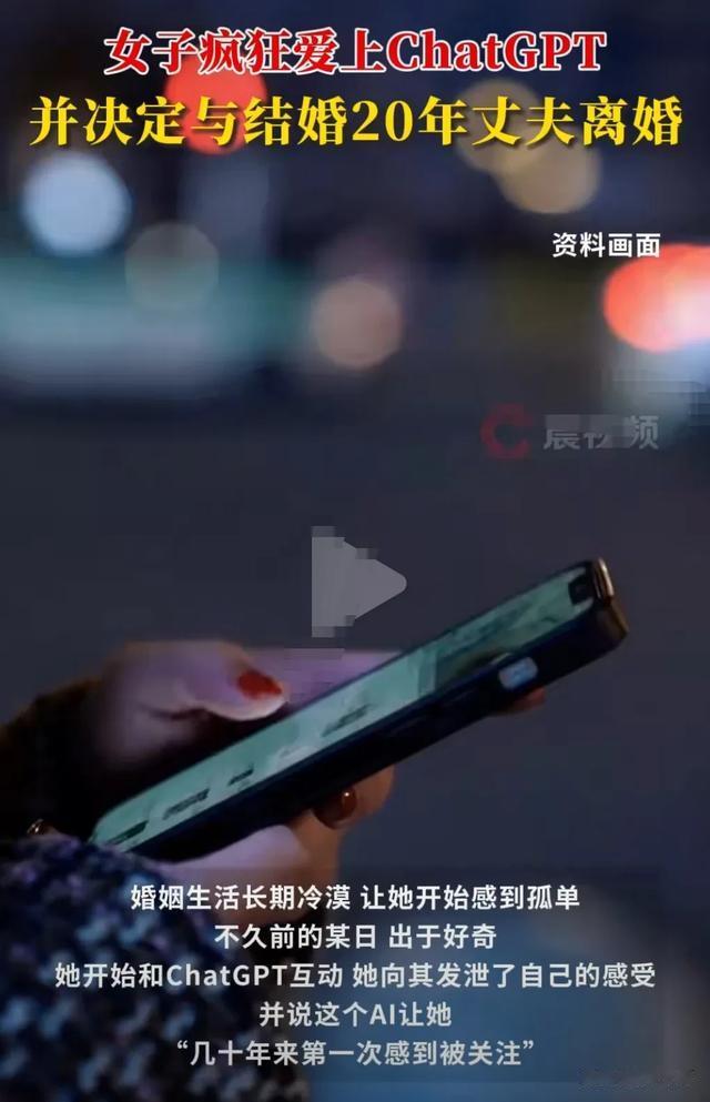 要知道两人结婚都快20年了,就因为AI男友能够理解她,所以让她觉得受够了现在的生活,要和丈夫离婚。