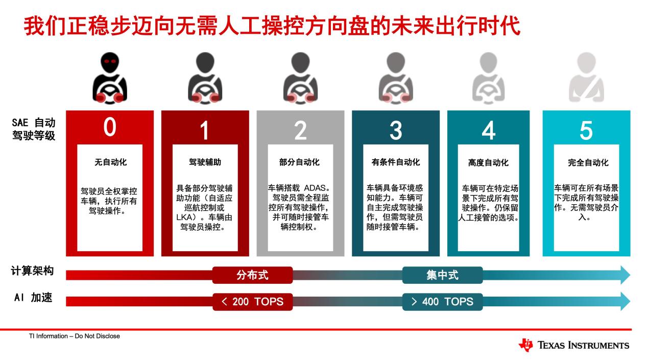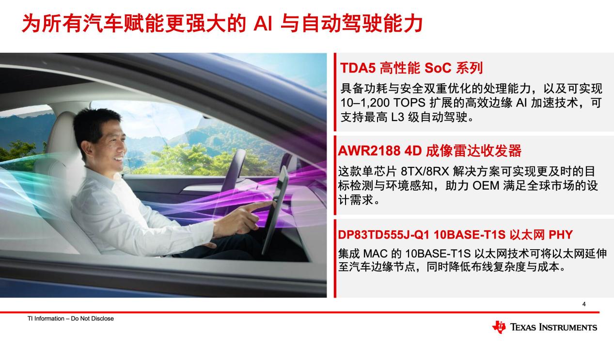 自动驾驶向L3跨越,算力需求增长与功耗、成本控制矛盾突出。TI的TDA5SoC系列专为高性能计算打造,可提供每秒10万亿次(TOPS)至1200万亿次(TOPS)运算的边缘人工智能算力,能效比超24TOPS/W。