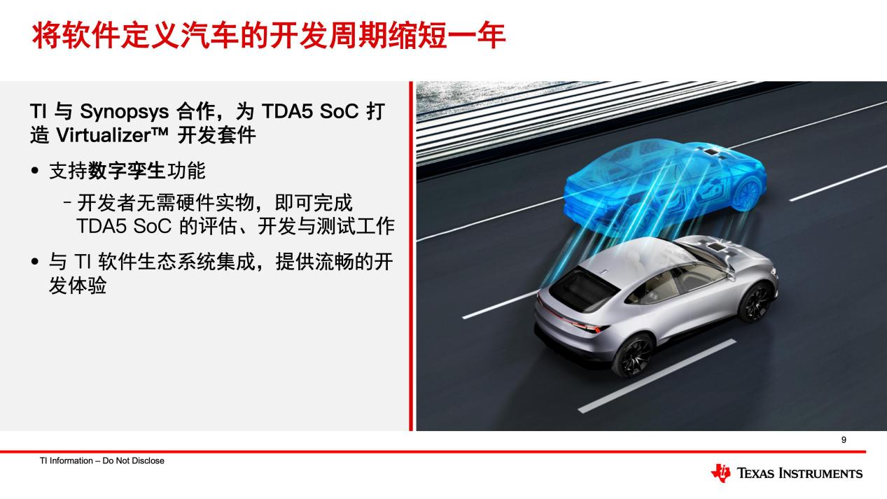 TI与新思科技(Synopsys)合作的虚拟开发套件,其数字孪生功能可帮助工程师可缩短研发周期12个月,加速高阶自动驾驶商业化落地。