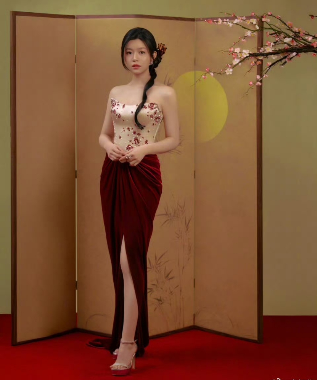 此次造型的破圈密码,藏在细节里的东方美学。陈妍希身着金泠枳品牌2026春夏高定礼服,米白色抹胸与酒红色丝绒裙摆形成视觉碰撞,裙身手绣的蜡梅枝桠随步伐摇曳生姿。最绝的是发型设计——将长发编成复古侧麻花辫,发间点缀红色蜡梅发簪,既呼应新春主题,又巧妙修饰脸型。当她提着裙摆走上红毯时,生图镜头下的肌肤白皙透亮,下颌线紧致流畅,网友戏称“这哪是42岁?分明是‘满40减20’的冻龄奇迹!”