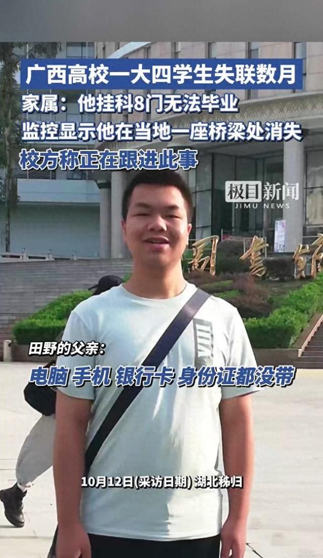2024年6月,湖北的田先生表示自己的在广西池河学院上学的儿子田野失踪了,家里人到处寻找仍然未果,在一筹莫展时,田先生从学校获知一个重要消息,田野考试有8科不及格,这对于一个即将毕业的大学生来说,可不是什么小事,意味着毕不了业,拿不到毕业证。