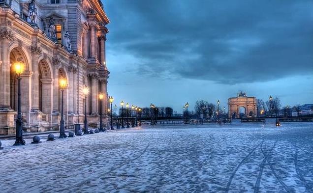 法国巴黎大概在北纬48度左右,冬季的巴黎是这样的,雪下起来有点“温柔”;