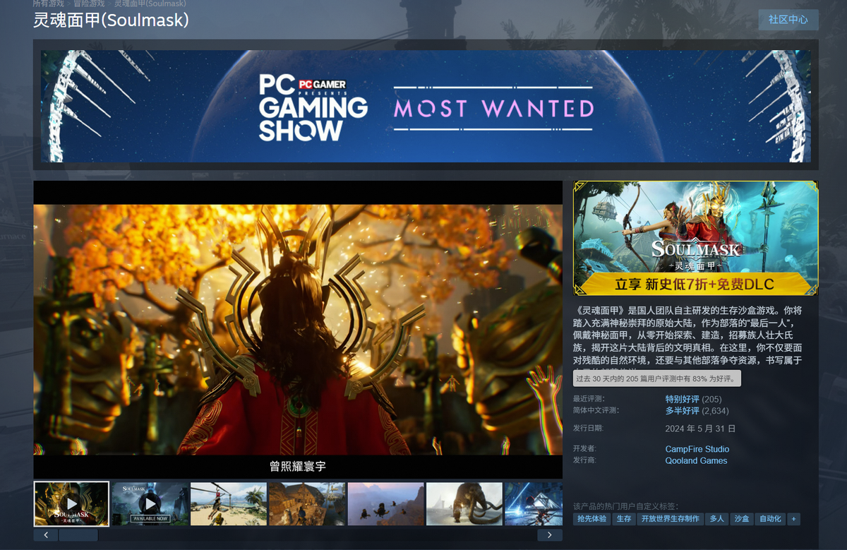 这款被挑眉哥称赞的游戏《灵魂面甲》,是一款由中国开发团队自主研发、主打真实体验的生存沙盒游戏。2024年5月31日EA版本一经上线即登顶全球Steam热销榜榜首,并位列2024年Steam国产买断制游戏销售额第二名,仅次于《黑神话:悟空》。目前累计销量已突破七十万套,在Steam近期评分中获得86%的“特别好评”,其简体中文评论仅占约20%,广泛好评来自全球市场,一度让国内玩家惊叹“这居然是国产游戏”,印证了其国际影响力。