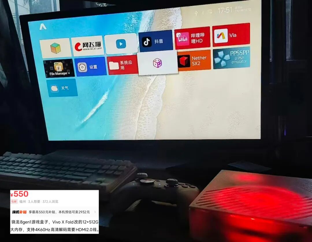 最后是价格,这台改造的成品机开价550元,属于骁龙8Gen1游戏盒子的正常水平。但这么大的风扇改法确实少见,再加上一些流媒体软件,还可以当电视盒子去玩,这就不延展了。