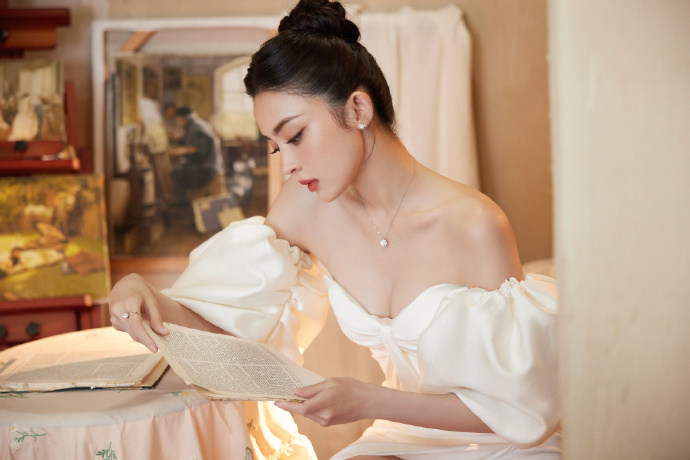 在画廊的一隅,娜扎手捧书籍,仿佛是从古典油画中走出的女子,知性而优雅,让人忍不住想要靠近,聆听她的故事!