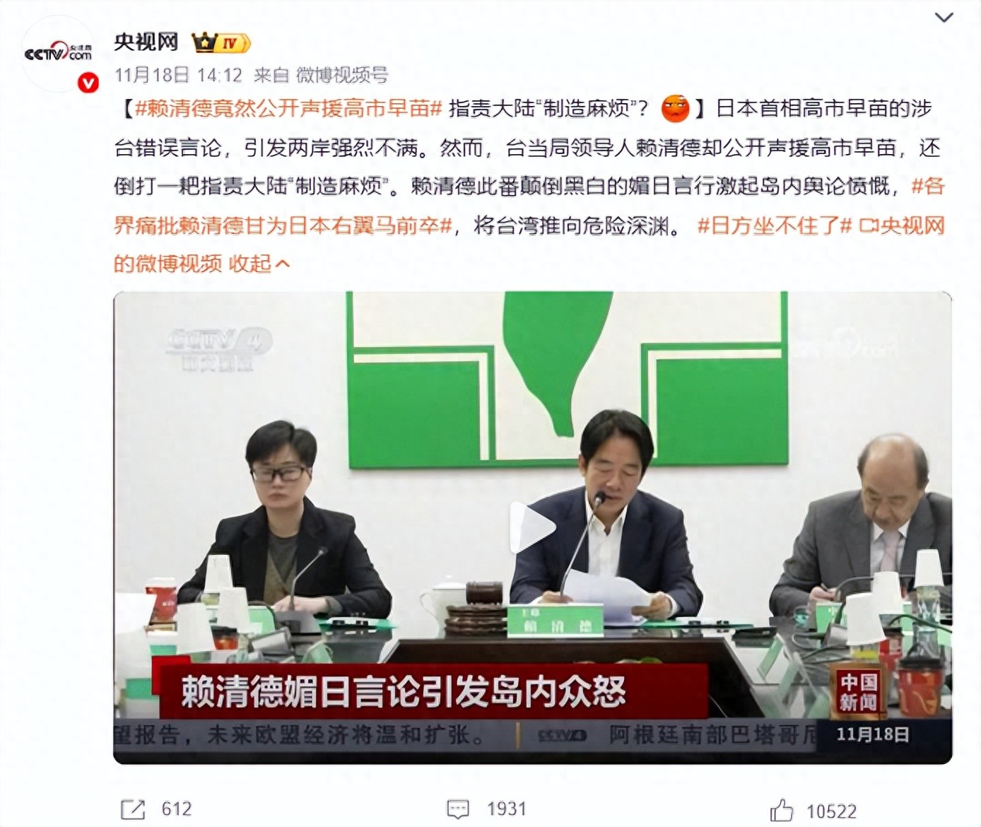 赖清德显然对于以高市早苗为代表的日本军国主义势力分裂中国的表态非常兴奋,立即就公开声援高市早苗,还公开对大陆倒打一耙。