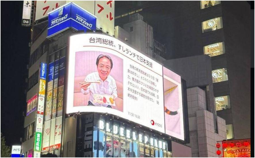 赖清德向日本献媚、跪舔的样子,立即被放上日本的街头大屏广告上,反复地播放。