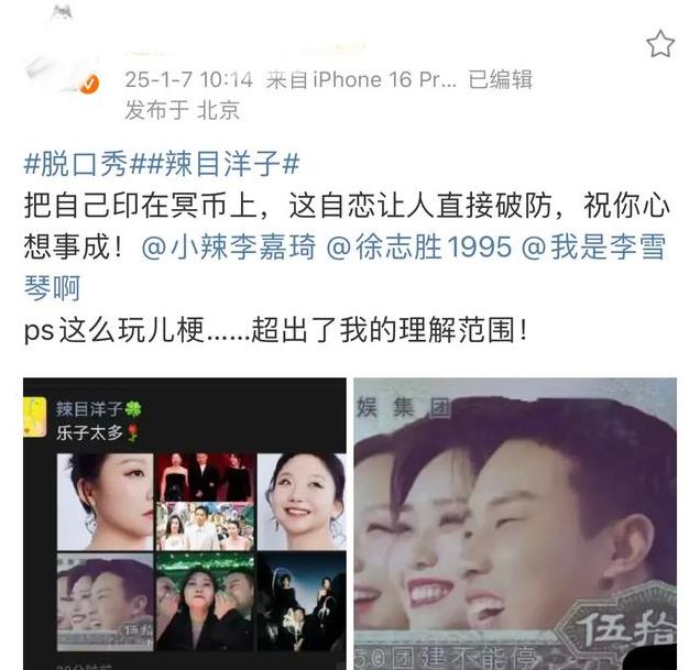 该狗仔曝光,辣目洋子将自己印在了冥币之上,同样被P图上去的还有徐志胜和李雪琴,这种玩梗的程度,还真的是让人大跌眼镜。