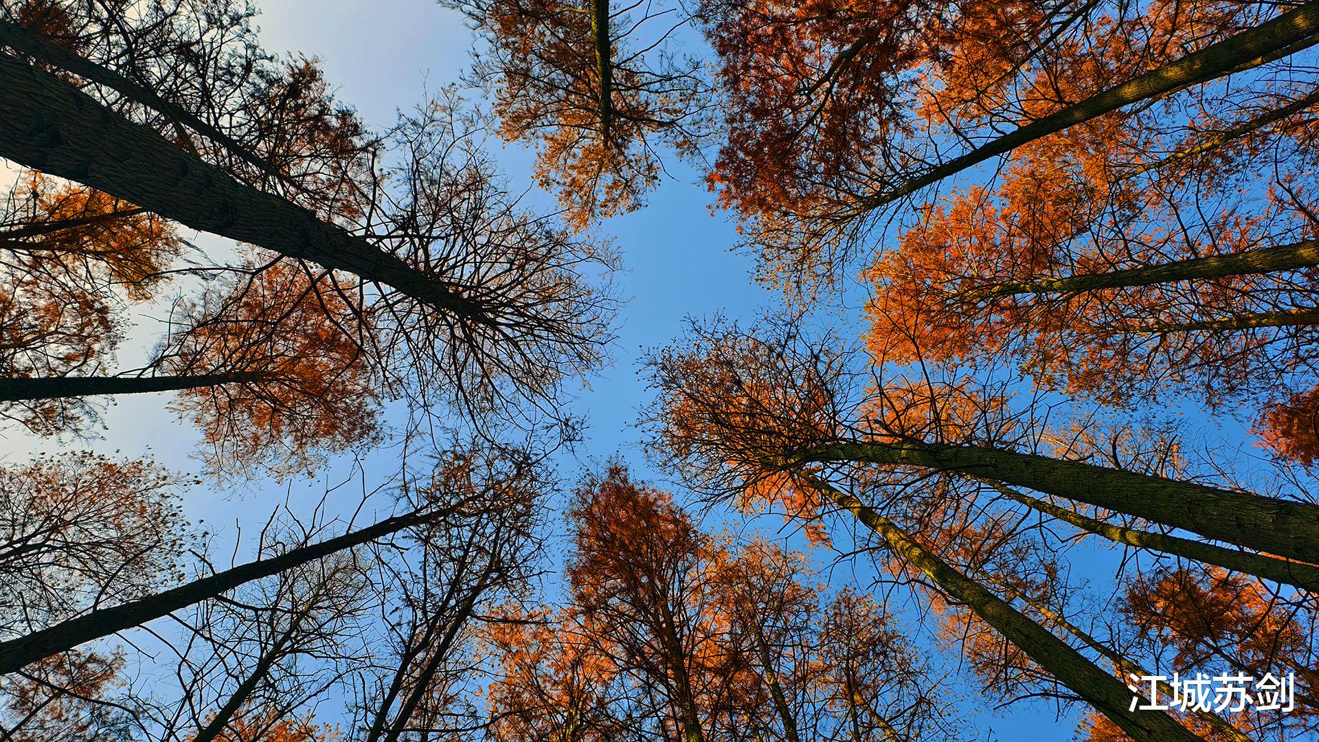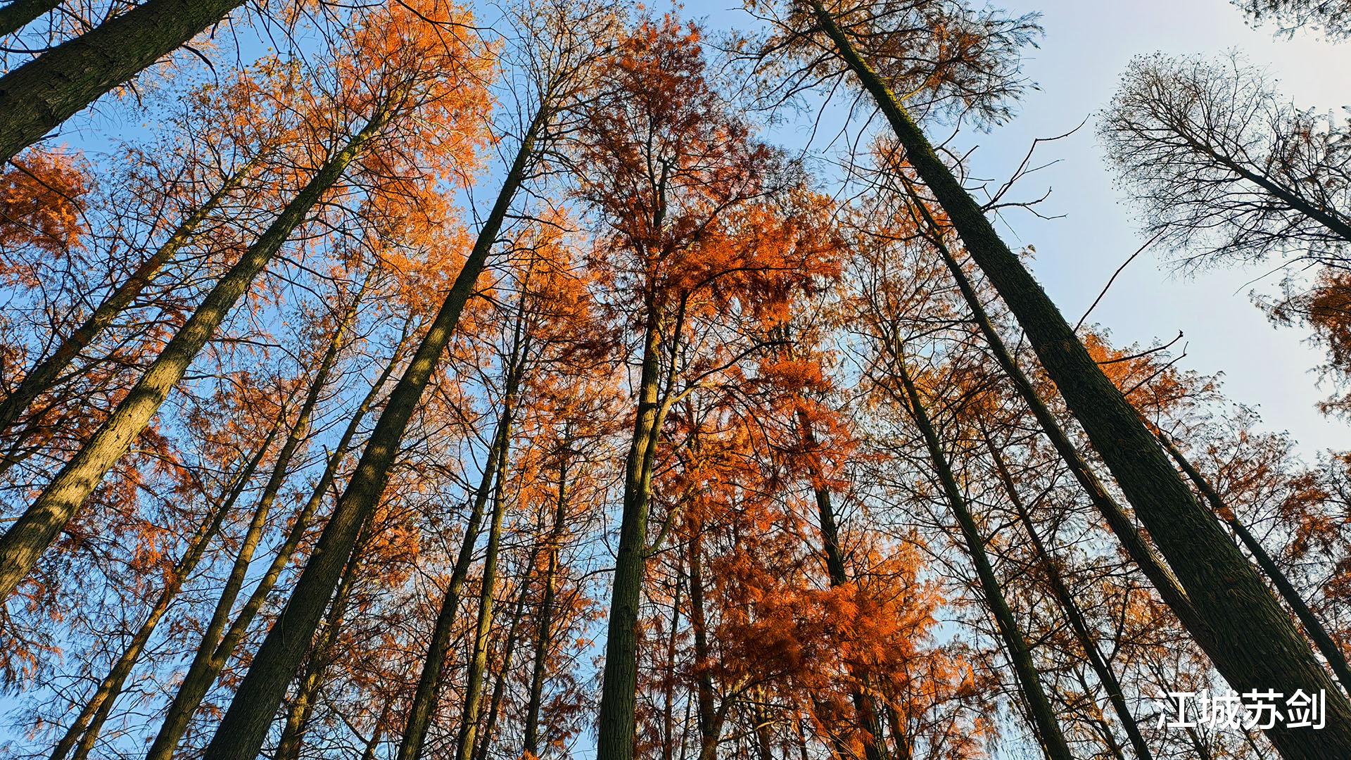 远处湖面泛着寒光,与杉林倒影交织成一幅静谧水墨。驻足仰望,杉树直指苍穹,像坚守岁月的哨兵,沉默而坚定。此刻,城市喧嚣被屏蔽,唯有自然与心跳对话。冬韵不在萧瑟,而在这份清冽中的从容与安宁。