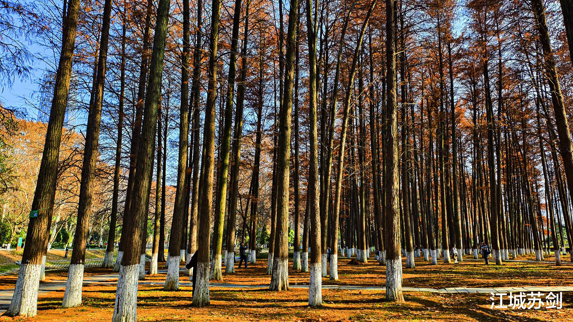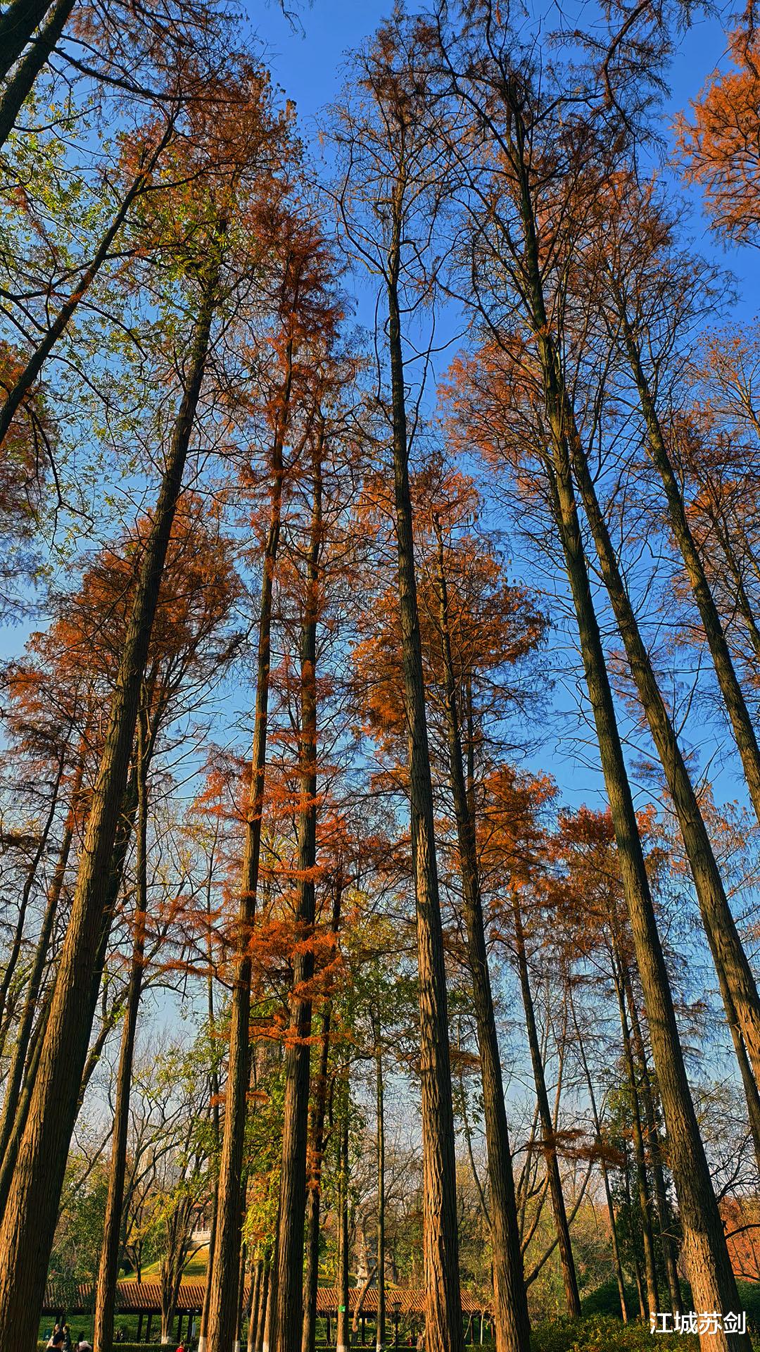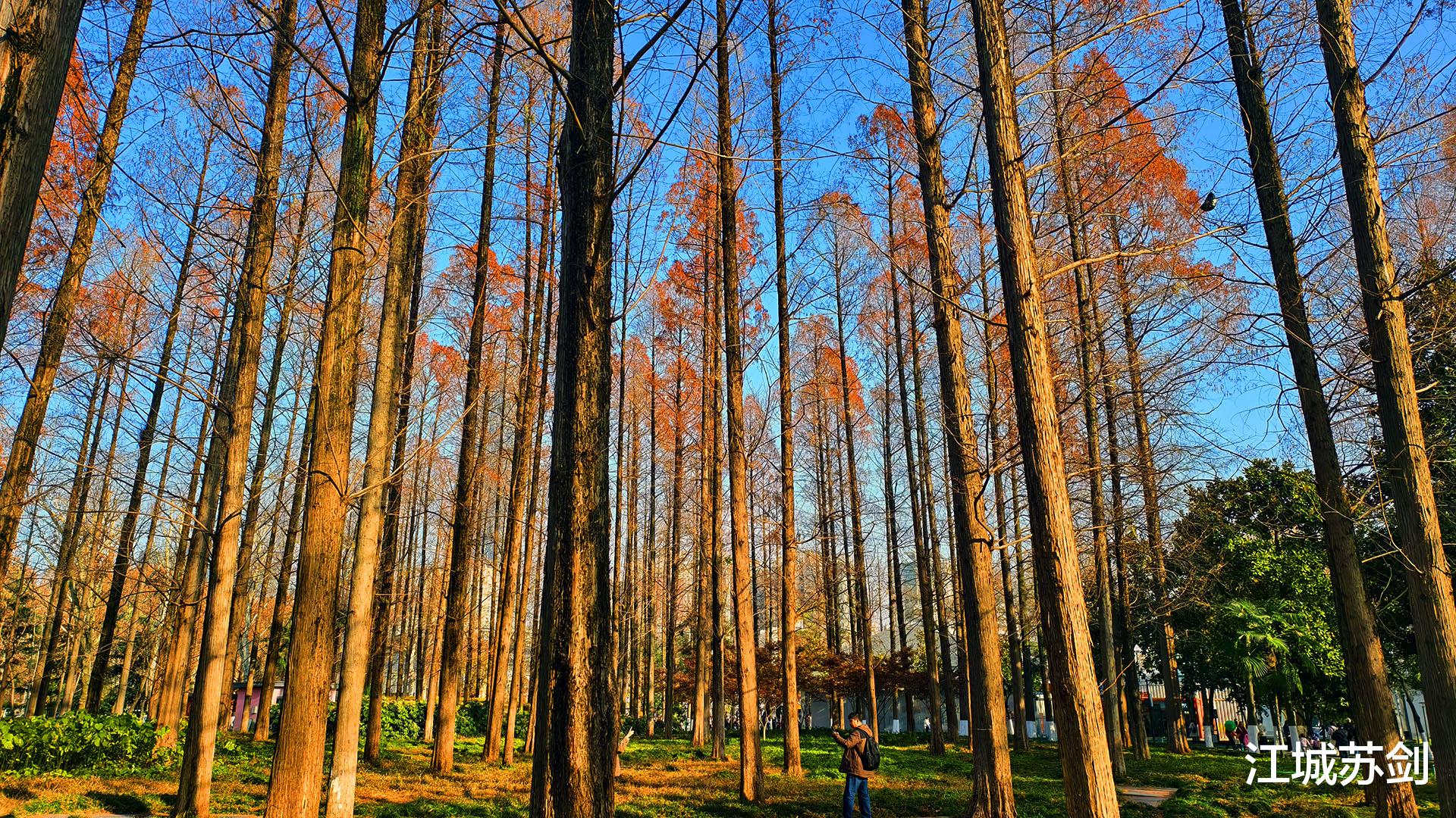 漫步武汉解放公园杉树林,冬日阳光透过高耸的杉枝洒下斑驳光影,像碎金铺陈在松针铺就的地毯上。空气清冷,却带着淡淡松香,沁人心脾。林间偶有鸟鸣,清脆如冰珠落玉盘,更显幽静。脚下落叶轻响,仿佛大地低声细语。