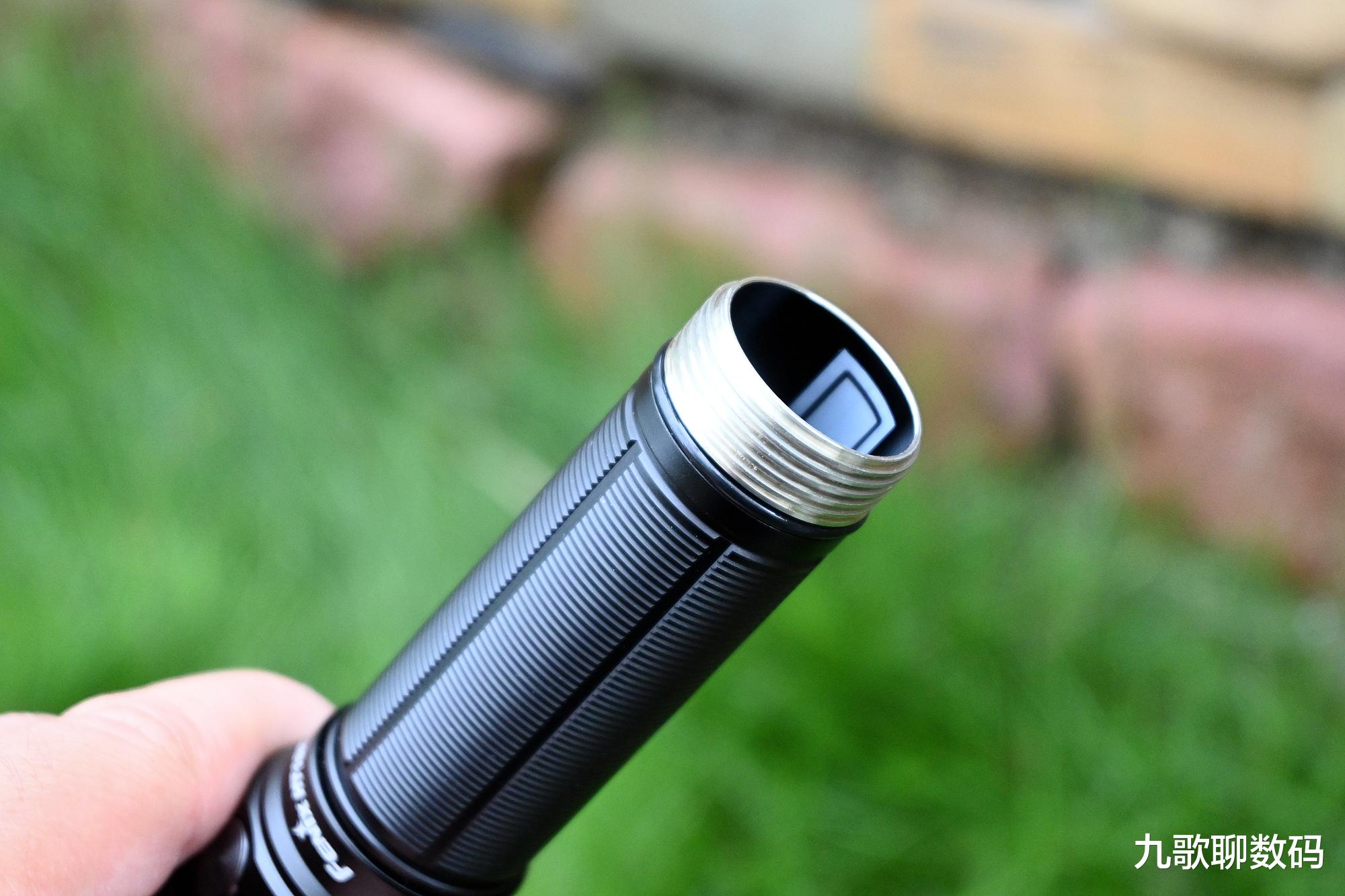 手电做工、用料都很扎实,拧开尾盖后可以看到内里细密的螺纹和电池正负极指示标识。