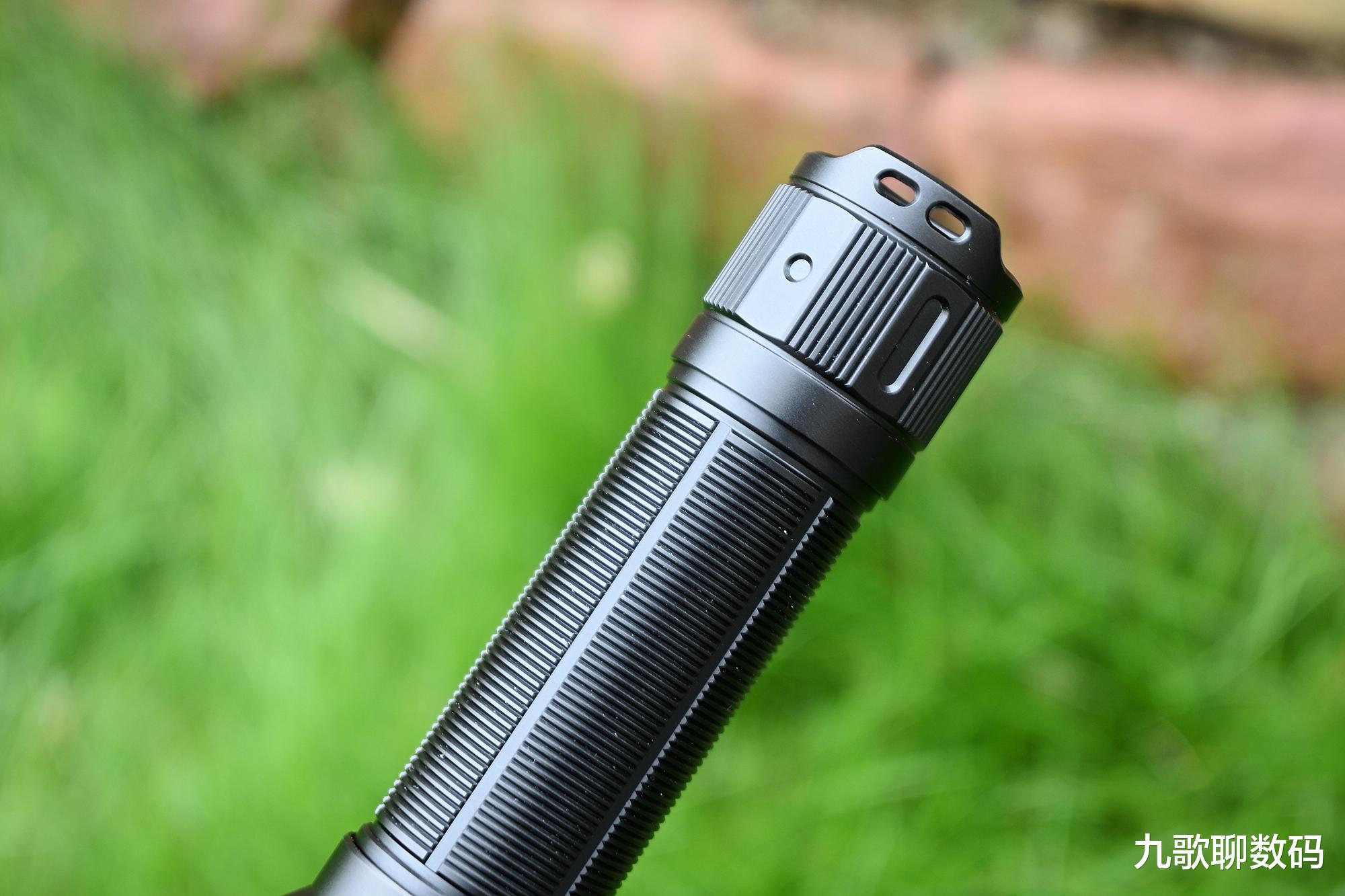 两开关均为金属键位,手感很舒服,也并无松垮的感觉。在功能键下方还有一颗红/绿双色的电量指示灯。可直观查看了解当前剩余电量情况。作为一款远射手电,HT18R V2.0虽然筒身粗壮,但却“粗中有细”,细节处做得还是很精致的,不愧为一线大厂的品质。