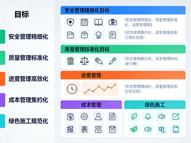 5、绿色施工规范化目标扬尘污染达标控制:建立扬尘实时监测系统,采取洒水降尘、物料覆盖等措施,确保扬尘污染达标。