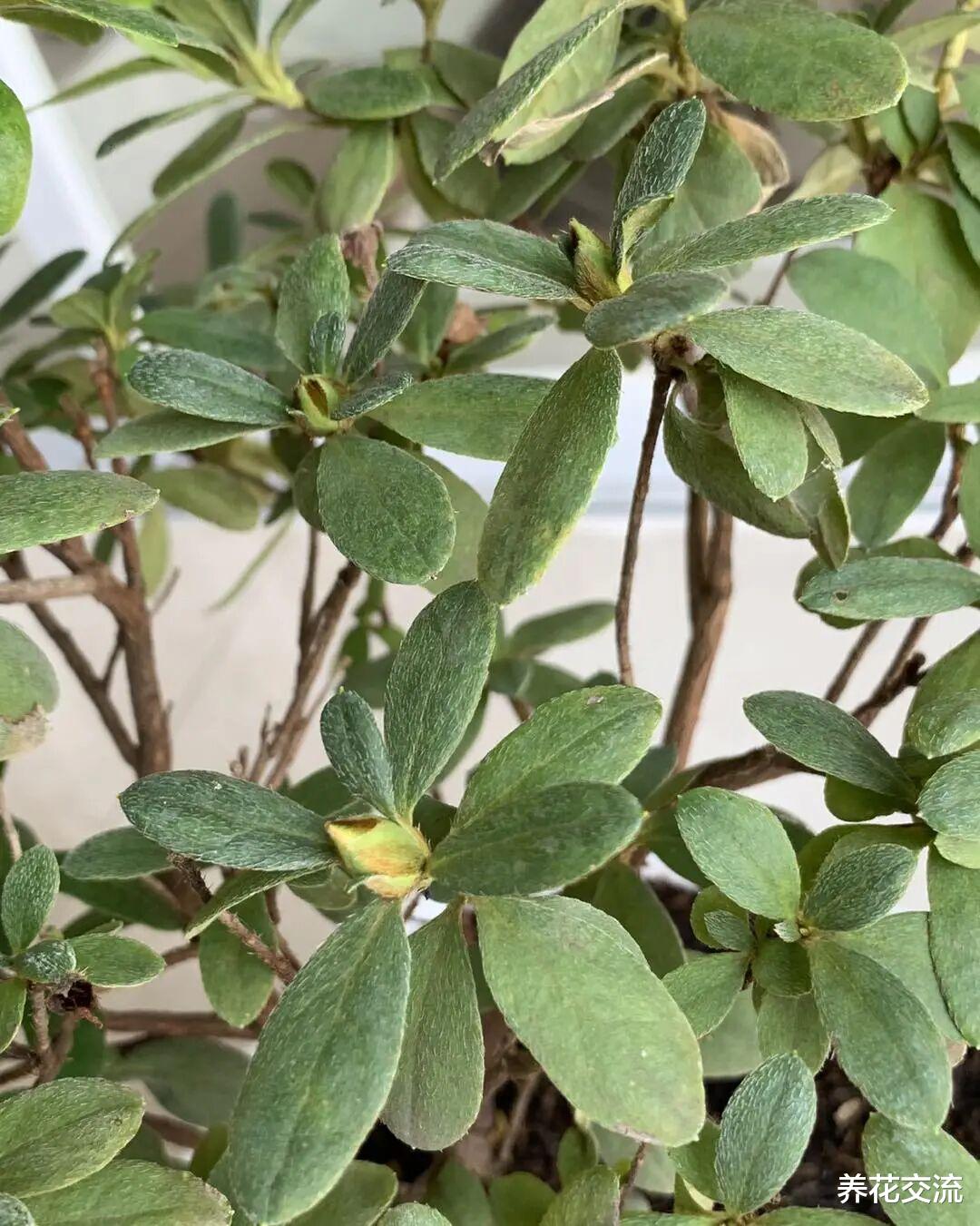 如果你发现杜鹃花新长出来的叶子发黄,但叶脉是绿色的,而且叶子整体偏白,那一般就是缺铁性黄叶,说明盆土偏碱了,这是典型的黄化病。出现这种情况,新叶就没有办法正常合成叶绿素,想要改善可以补充一些腐熟的有机肥,每隔半个月到一个月补充一次酸性肥,比如矾肥水或硫酸亚铁。