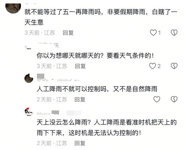 有些网友抱怨说雨水降得不是时候,这人工增雨必须借助自然有机条件才可以作业,它不是龙王,嘴巴一张,雨水就哗哗下!