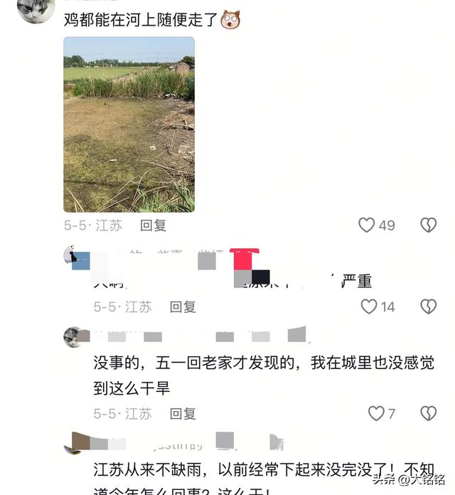 有网友晒图说:村里的河很多都干了,鸡都能在河上随便走