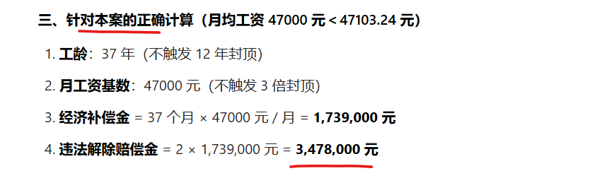 我们举一个较为极端的例子,北京地区,劳动者大学毕业22岁时加入公司,在公司一直工作到退休前59岁,司龄37年,离职前月平均工资47000元,违法解除的赔偿金可高达3478000元。