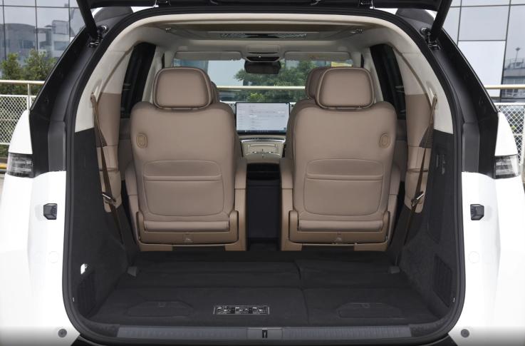 体验者不变,保持前排座椅位置不动,坐到第二排,座椅调整到靠后的位置,此时二排头部空间剩余1拳,腿部空间超2拳。接着保持二排座椅位置不变,同一位体验者从二排中央过道进入第三排,头部空间所剩无多,只有大概2指左右,腿部空间剩余1拳,空间宽适度良好,符合一台中大型MPV的空间表现。而值得注意的是,小鹏X9增程版不仅座舱内部空间“无打折”情况,后备箱装载能力也得到了保留,后备箱依旧是下沉式设计,第三排座椅展开有可观的装载空间,同时三排座椅支持翻折收纳,空间利用率高且灵活性强。