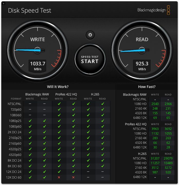 此外,我们还利用Blackmagicdesign Disk Speed Test、ATTO Disk Benchmark软件进行测试,看以下截图结果。前者检测读写性能,顺利通过Blackmagic RAW、ProRes 422 HQ、H.265等高分辨率高码率格式的实时读写;后者检测对大小文件的处理能力,如果进行4K视频剪辑,基于1.9GB这个稳定速度写入,理论上1分钟可以传输114GB的素材,很适合处理高分辨率视频包括RAW照片等,快速省心。