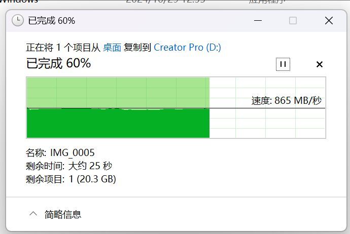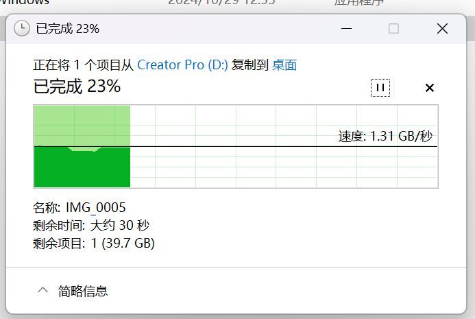 至于实际文件传输方面,还是以单个50GB以上的MOV视频文件传输作为示例,闪迪创作者系列移动固态硬盘的读取速度达到1.31GB/s,写入速度865MB/s,充分展示出高速率优势。
