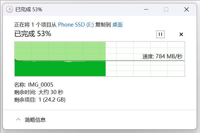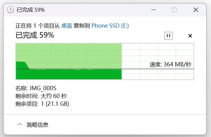 考虑到测速软件与实际传输存在一定差距,我们还同步测试了该产品和电脑系统盘之间的文件传输表现:传输单个50GB以上的MOV视频文件,读取速度784MB/s,写入速度364MB/s,属于主流以上的水准。