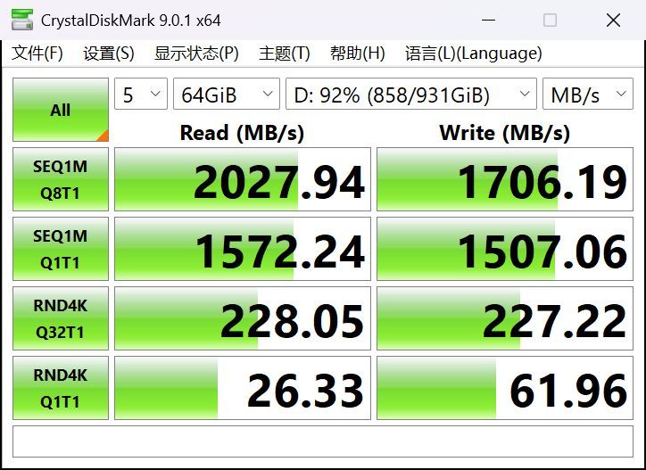 接近满盘的顺序读取速度约2017MB/s,顺序写入速度约2022MB/s,与空盘速度基本无异。再到64GB级别测试,顺序读取速度约2027MB/s,顺序写入速度约1706MB/s,写入稍有落差。