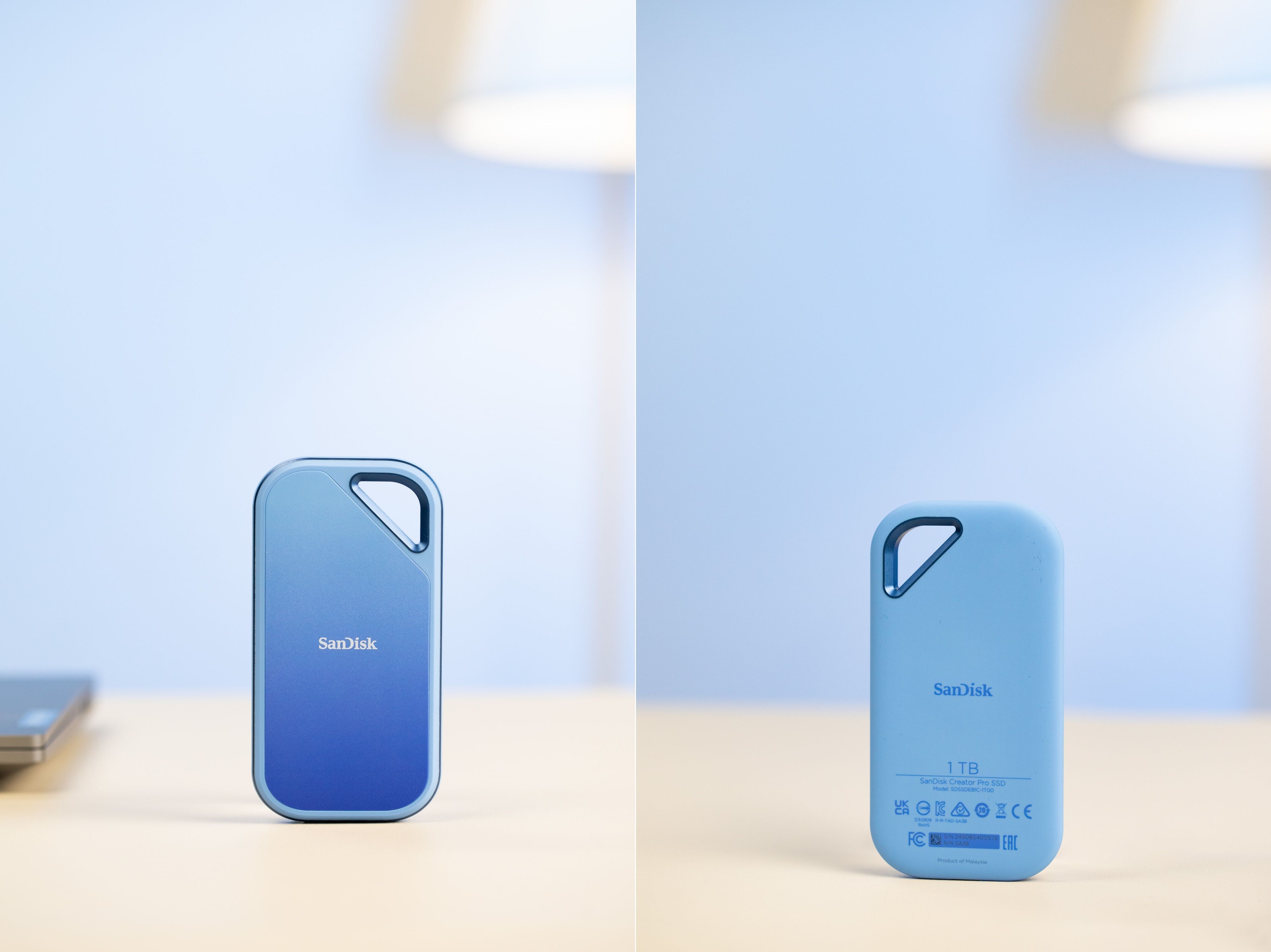 在外观方面,这一移动固态硬盘延续家族式的设计语言,饼干状造型,重量约77.5g,在同级别产品中显得小巧,携带轻便。搭配创作者系列独有的蓝紫渐变,同样很有质感。又采用了金属和硅胶材质,保留登山扣环设计,防水防尘达到IP65级,能抵御雨水泼溅,能抗3米跌落,耐用性高,外出携带安心。