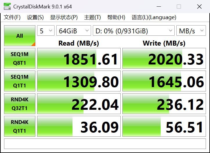 处于USB4接口时,空盘的顺序读取速度约2039MB/s,顺序写入速度约2039MB/s,表现喜人。再进行压力最大的64GB级别测试,顺序读取速度约1851MB/s,顺序写入速度约2020MB/s,读取速度稍有下降,表现尚算正常。