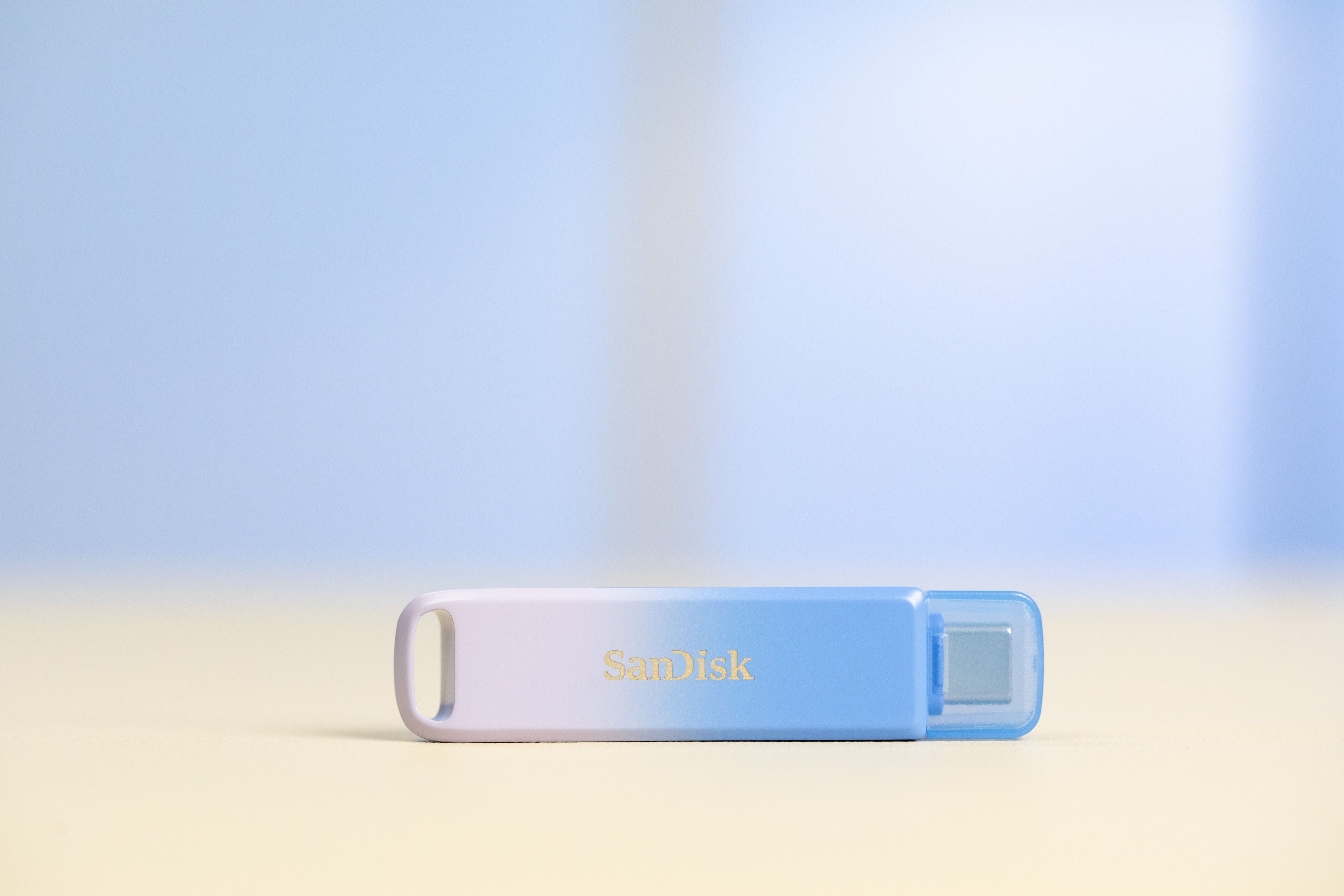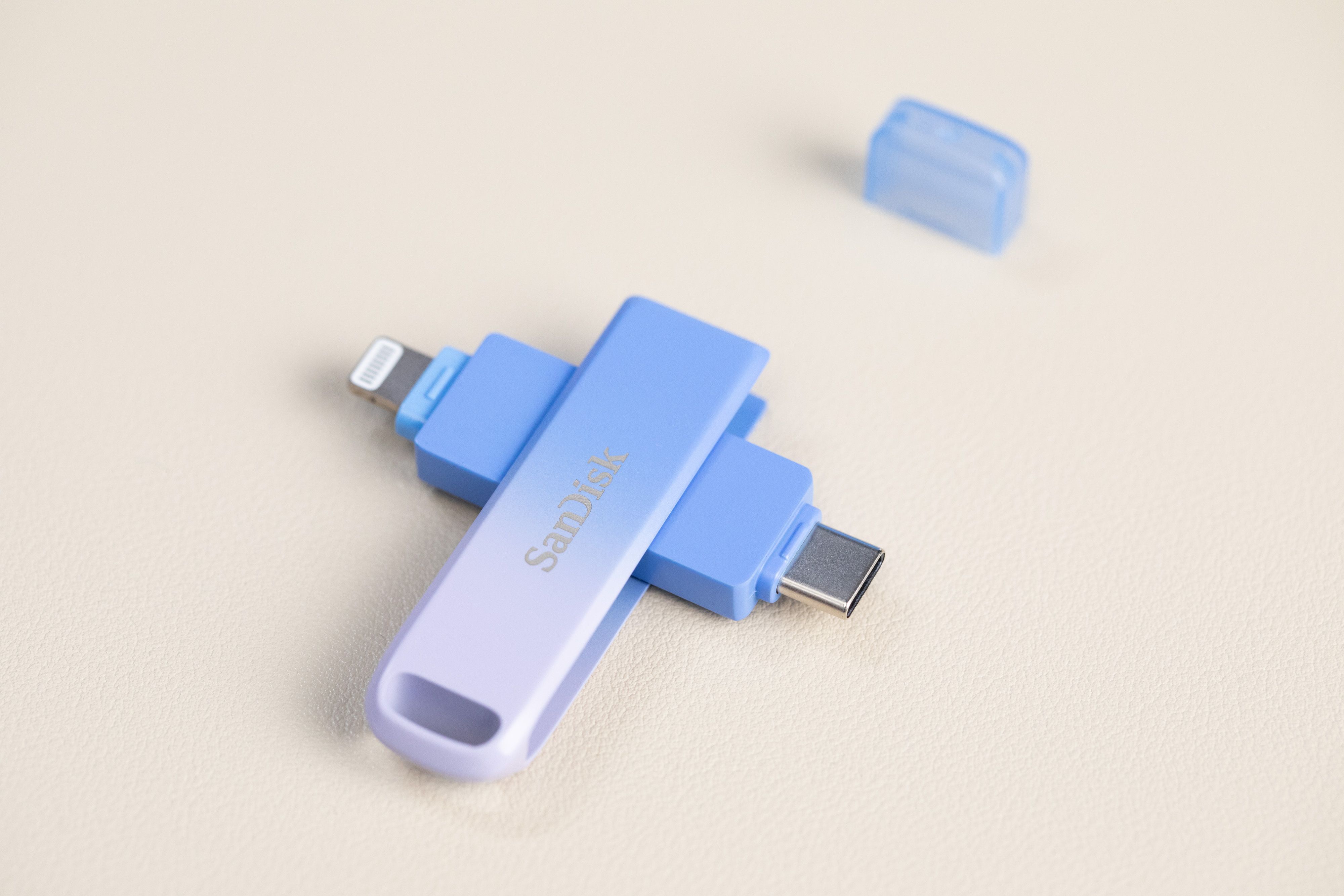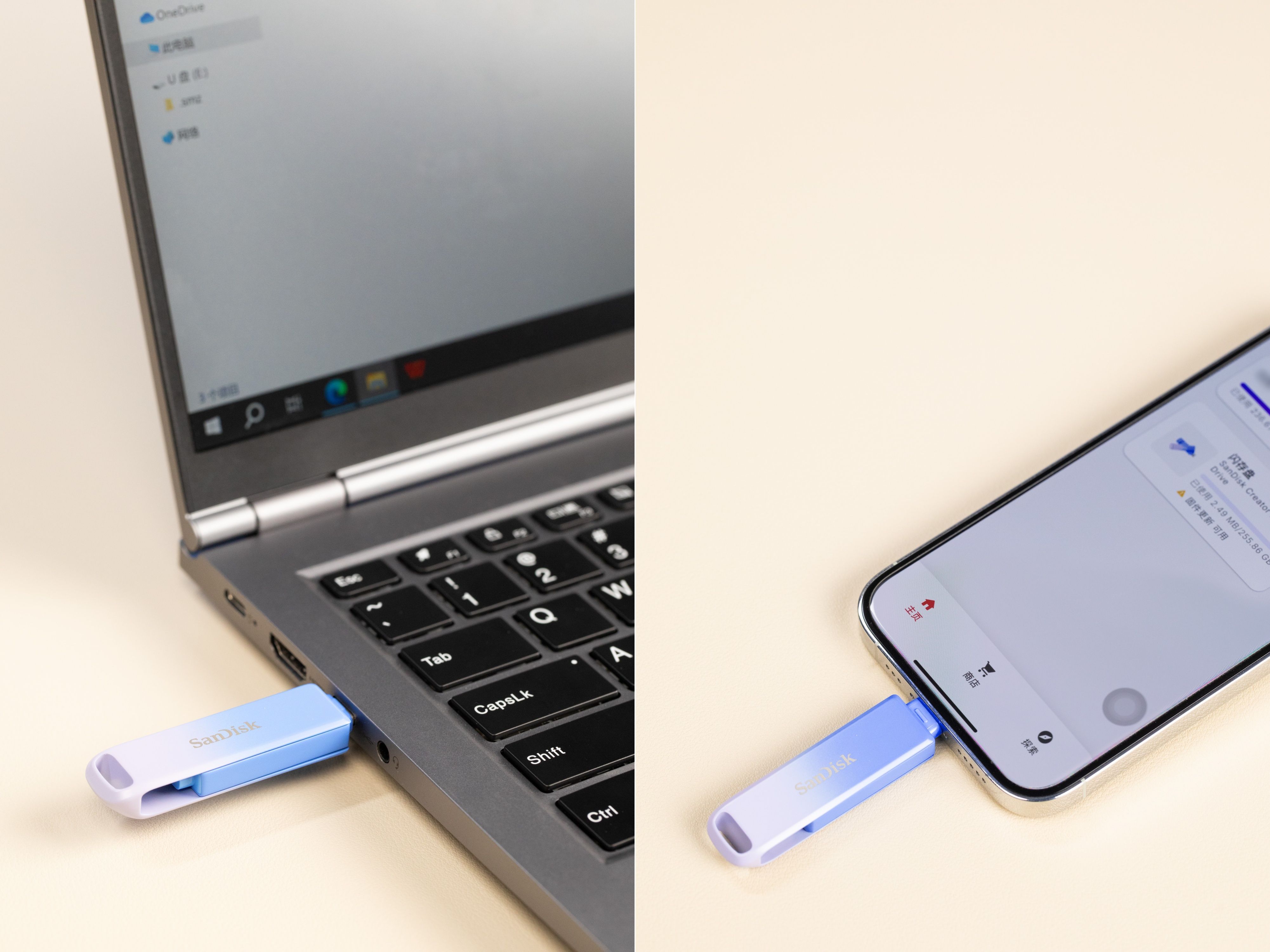 闪迪创作者系列的这款手机闪存盘,最大特性是双接口,拥有C口和Lightning口,同样是即插即用,可以在手机、平板、笔记本电脑、计算机之间轻松传输内容,避免过于依赖网络而遇到断网/流量不足的尴尬、线上发送压缩清晰度的问题等等。