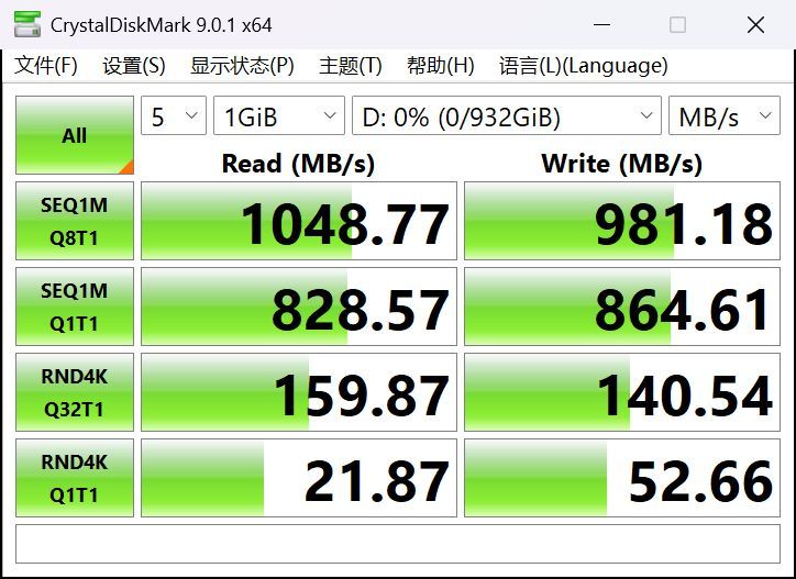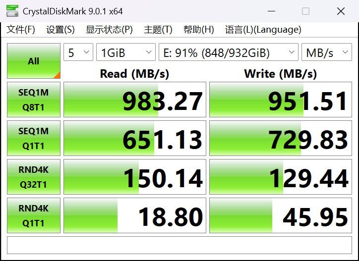 空盘下,该产品的顺序读取速度约1049MB/s,顺序写入速度约981MB/s,相较官方标称的还要高点,表现给力。接近满盘下,顺序读取速度约983MB/s,顺序写入速度约952MB/s,与空盘之间的速度变化不大,存储性能高效稳定。