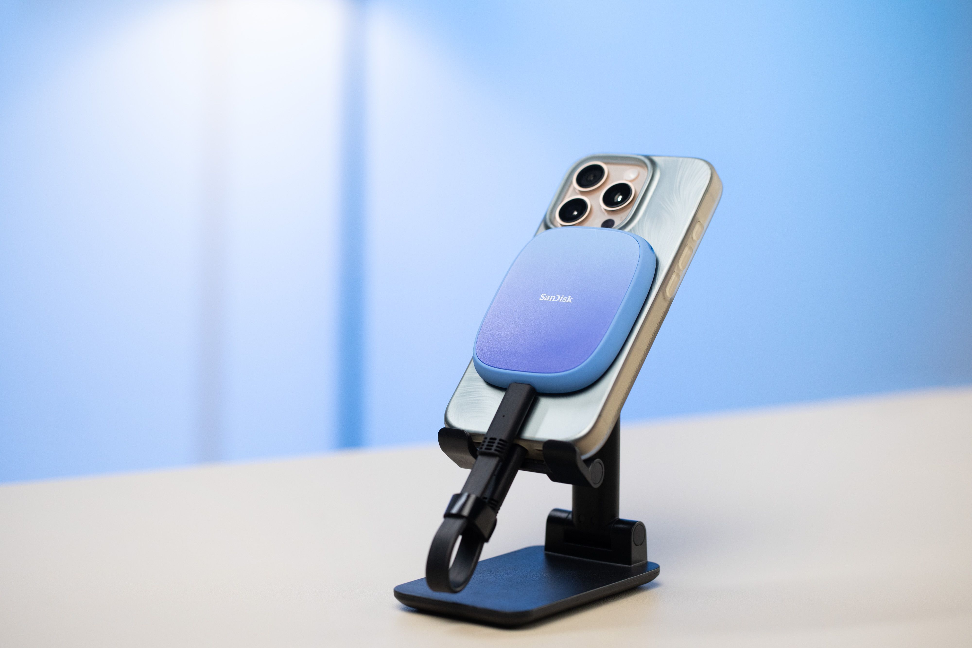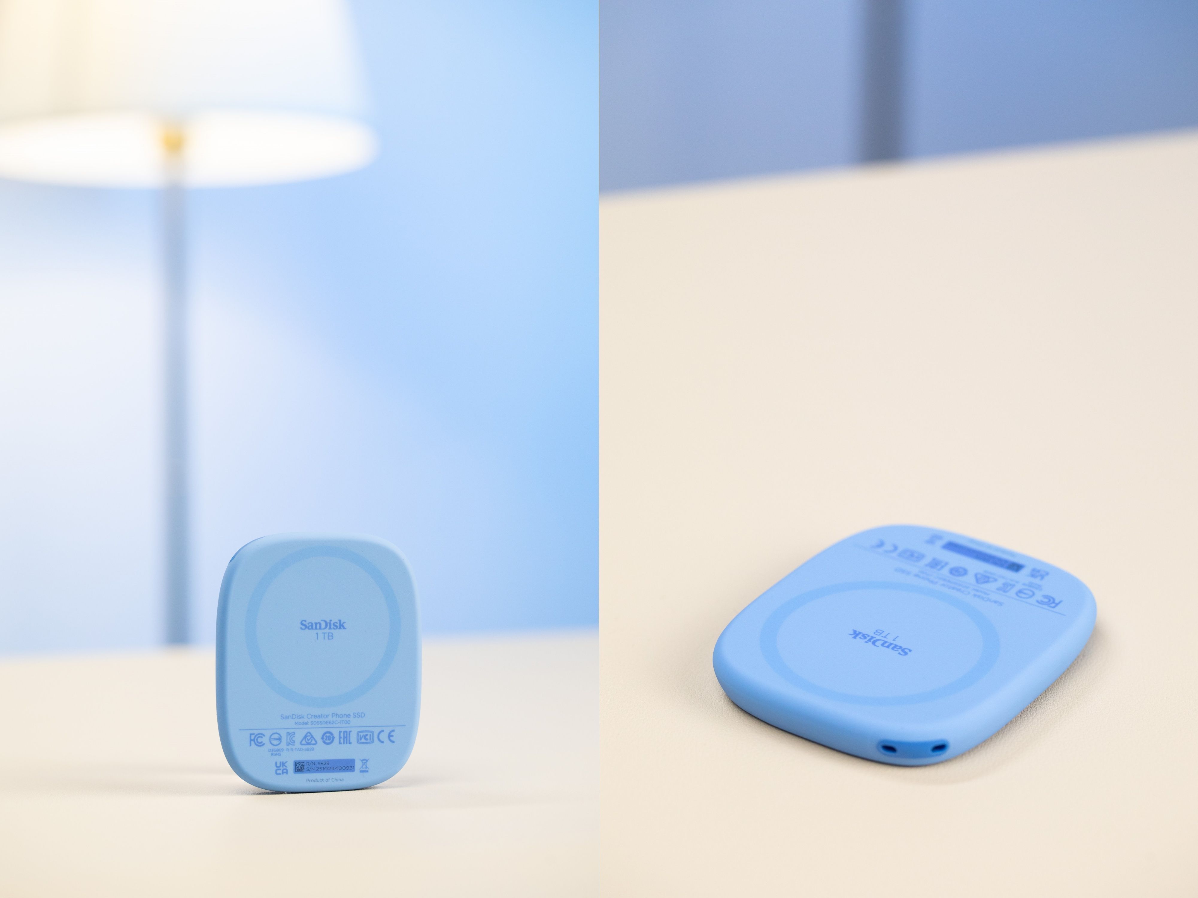 外观上,该产品采用了创作者系列专属的蓝紫渐变色,搭配高强度硅胶材质,触感柔和类亲肤。侧面看有着梯形切面,边角圆润,减少硌手感。产品正面标着闪迪 LOGO,背面为MagSafe磁吸区域,同时注明了“Creator”创作者身份。我们试了一下它的磁吸力度,吸附在支持MagSafe的iPhone上,提起移动固态硬盘可保持iPhone稳当不掉,磁铁的吸附力很足。