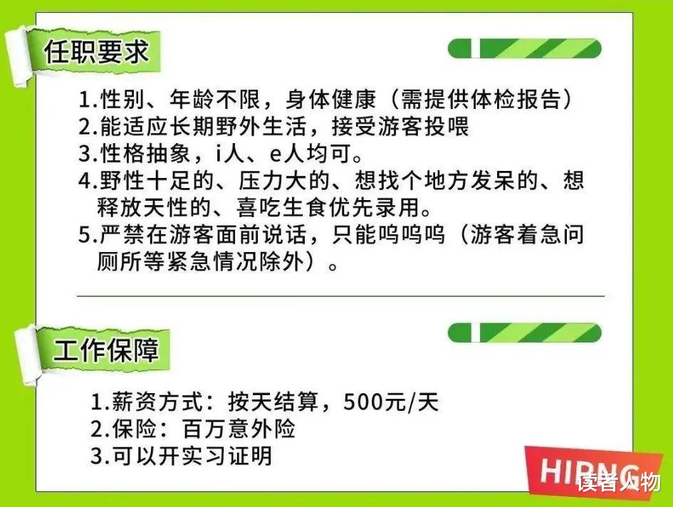 在招聘要求上,几乎看不到对学历性别年龄的要求,只有对“原始野性”的渴望:发呆、撒欢、跳舞、接受投喂都可以......