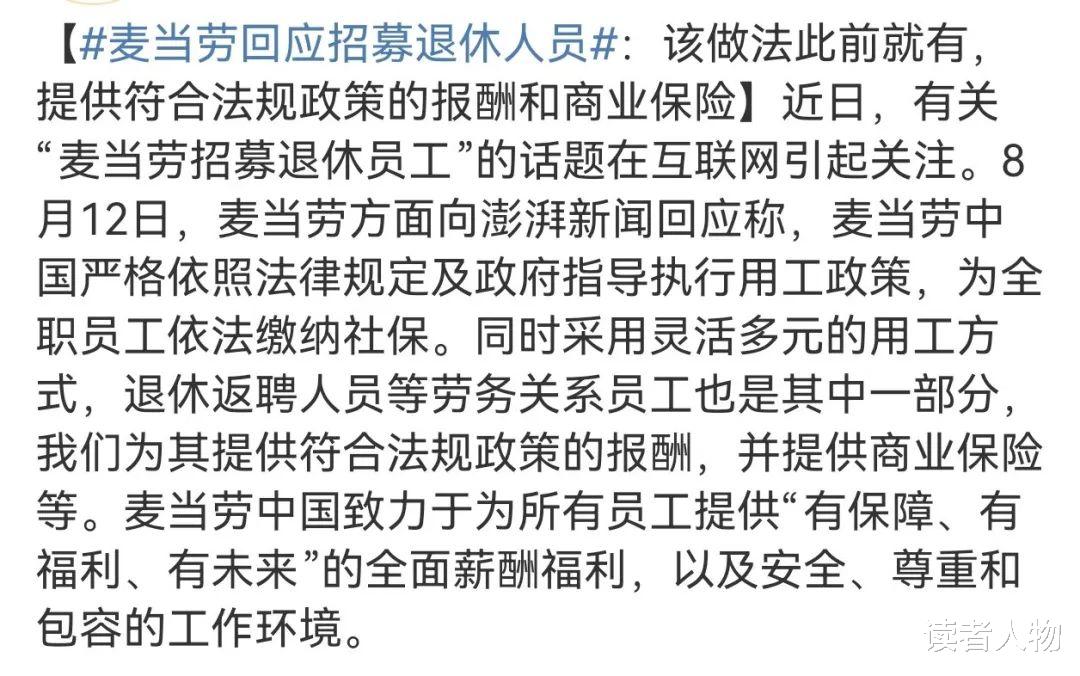 有人夸赞麦当劳暖心,给退休人员提供工作岗位,充满人文温度。