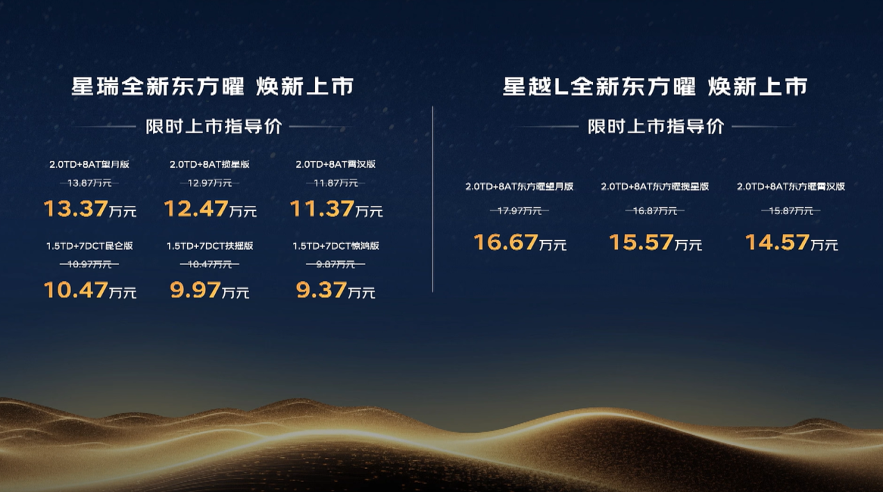 此次上市的新款星瑞东方曜共提供6款配置车型,限时上市指导价区间为9.37万元至13.37万元。同步推出的新款星越L东方曜则设有3款车型,限时指导价范围为14.57万元至16.67万元。极具竞争力的价格,配合国庆期间推出的限时购车权益,无疑为计划在假期购车的消费者提供了一个极具吸引力的选择。