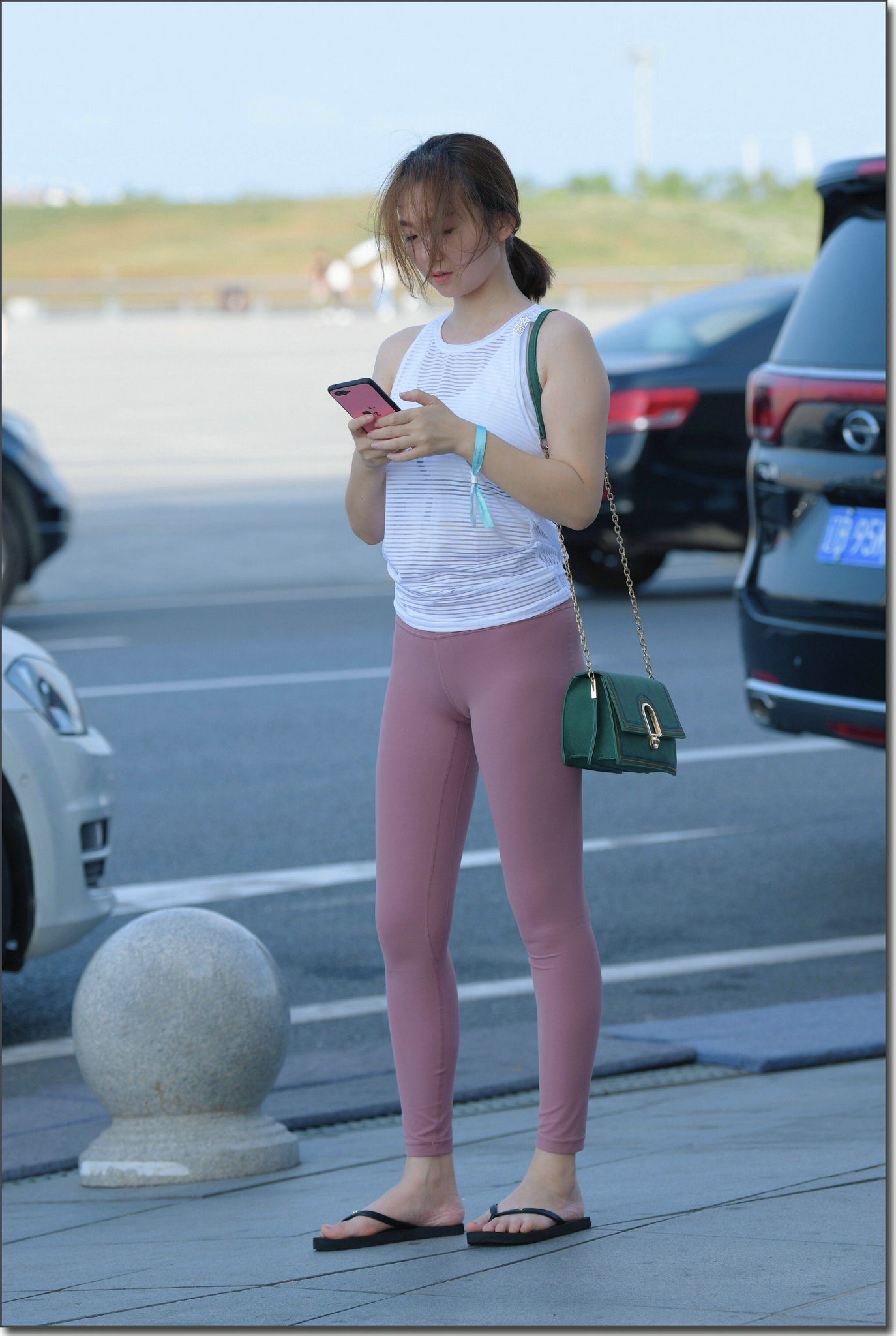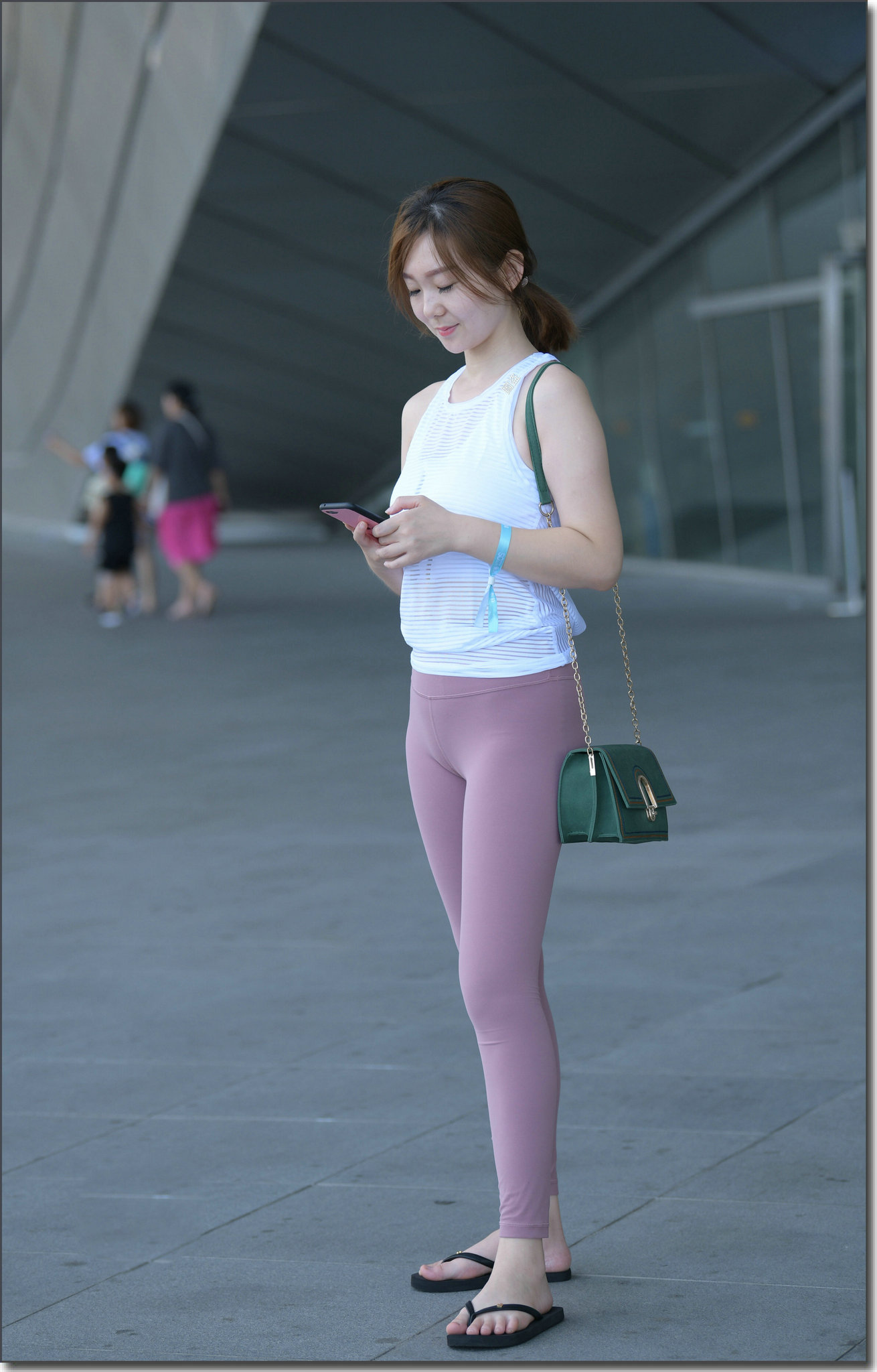 这个小姐姐穿着一件紧身的紫色裤和白色上衣,搭配一双抱鞋,将完美的身材展现的淋漓尽致。