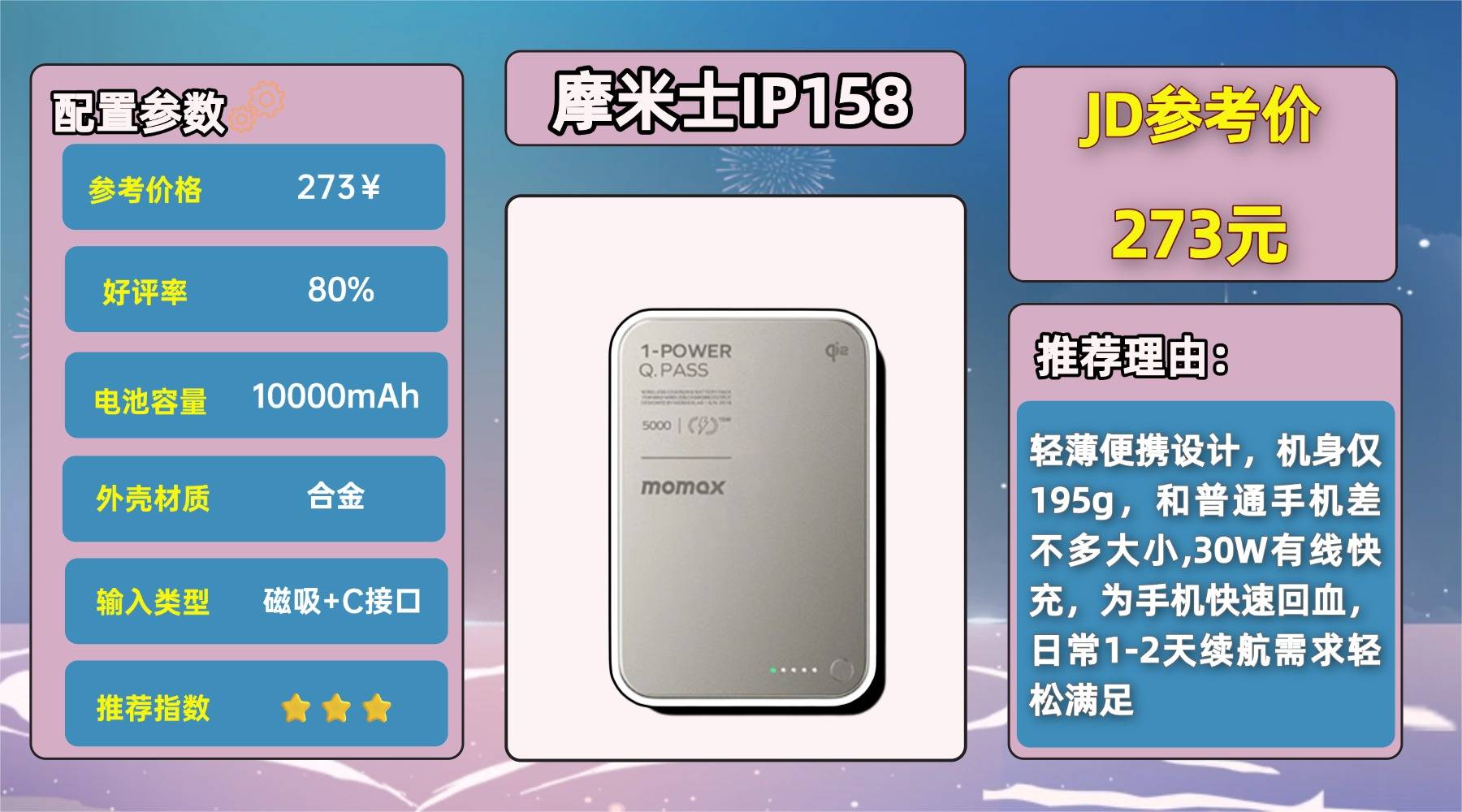 高性价比充电宝品牌有哪些?IP158 的优势在于体积和重量控制,接近手机的重量,随手塞进小包基本没有负担,通勤或短时间外出很友好。10000mAh 的容量对轻度使用者来说够用,一天内补电压力不大。
