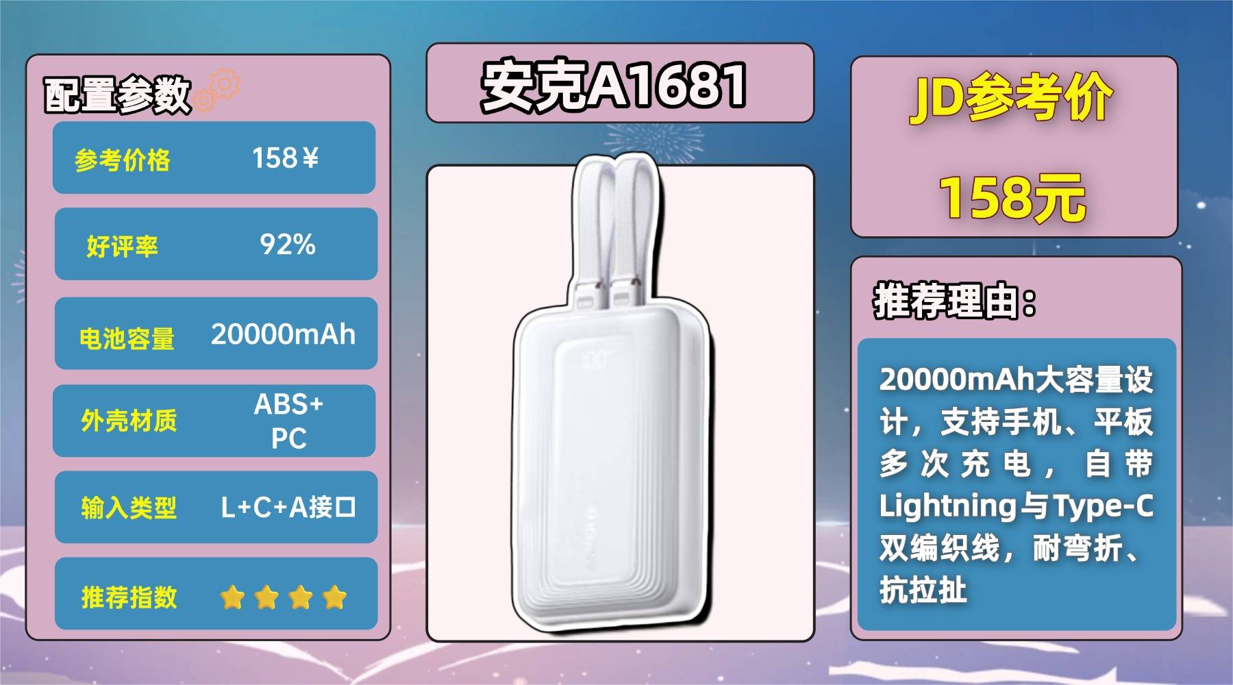 4、安-克A1681自带线充电宝