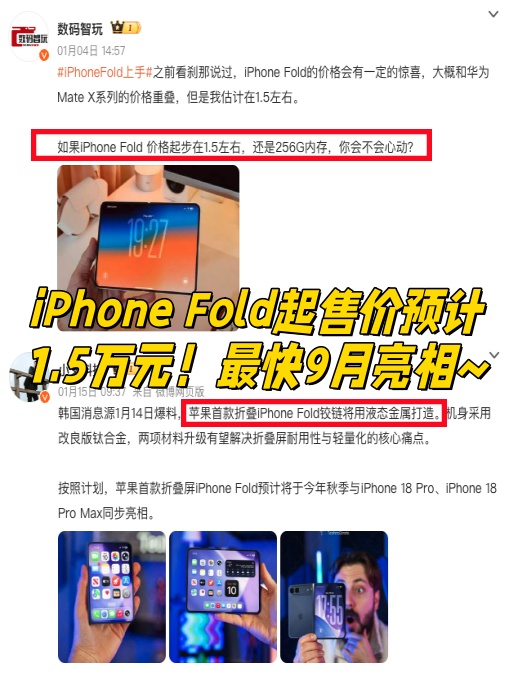 甚至有传闻称,苹果计划采用三星在CES 2026上展示无折痕屏幕技术,并且还要使用液态金属+改良钛合金做铰链和机身,从而一次性解决折叠屏的折痕和耐用难题。唯一的问题是,据说正式量产要等到2027年,而且价格可能会高达1.5万起……