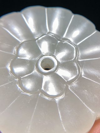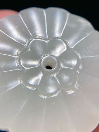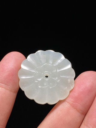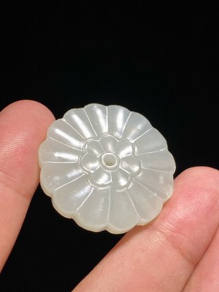 清中期 和田玉籽料 白玉 花形 玉佩 挂坠 吊坠 直径3.4厚0.6厘米 重12克 以白玉籽料雕琢而成,玉质坚洁细腻,厚重温润,犹如凝脂,略带沁色,带有静穆古雅之感。雕花瓣形,丰腴饱满,花瓣相叠,造型饱满,别具一格,雕工古拙。造型精致典雅、风格独特,器体轻薄,工艺精湛高超,为清代配饰精品。
