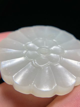清中期 和田玉籽料 白玉 花形 玉佩 挂坠 吊坠 直径3.4厚0.6厘米 重12克 以白玉籽料雕琢而成,玉质坚洁细腻,厚