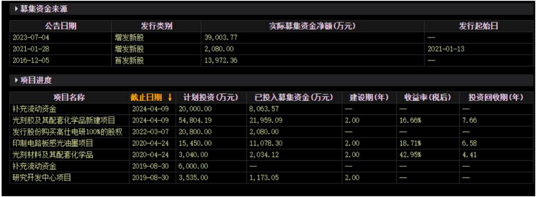 资本市场也成为容大感光发展的底气之一,公司2016年上市首发以来,已经通过资本市场融资超过5.4亿元,并通过发行股份并购等方式扩大企业综合实力。
