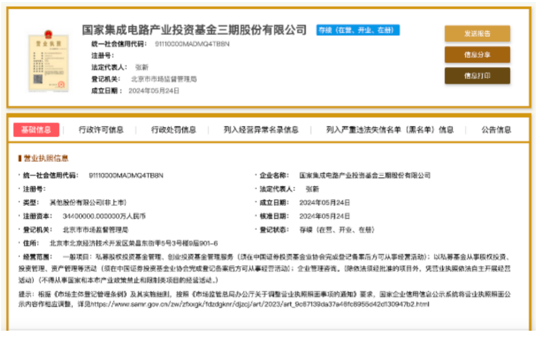 根据国家企业信用信息公示系统显示,国家大基金三期于2024年5月24日成立。