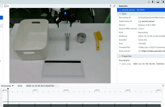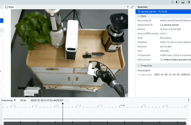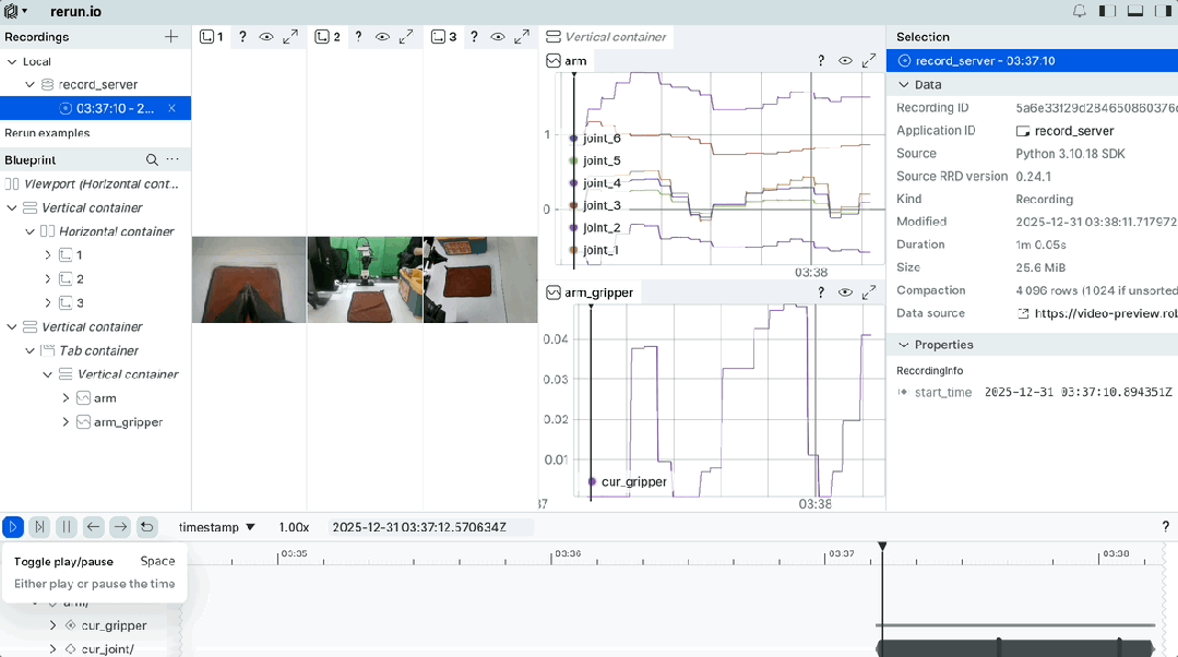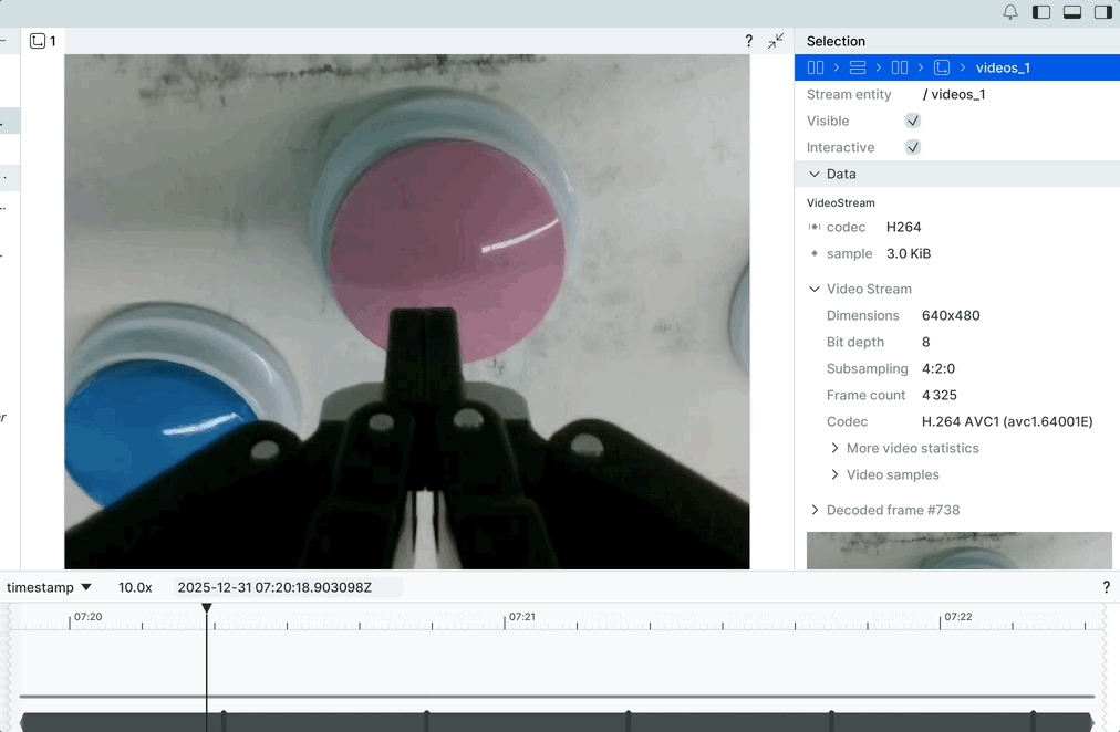 底部时间轴可以精准定位某一时刻,同步查看该时间点的视频画面与机械臂/夹爪状态,快速找到动作异常的环节。