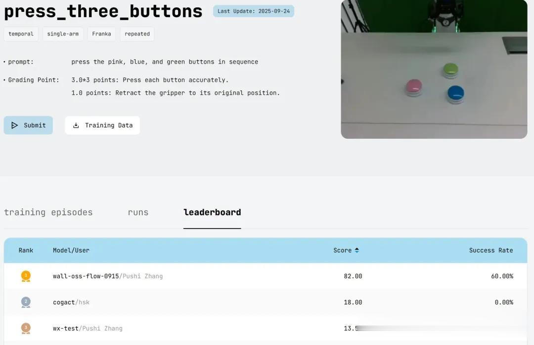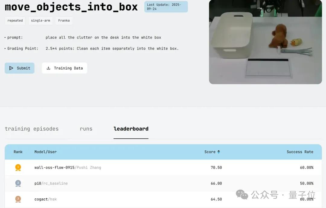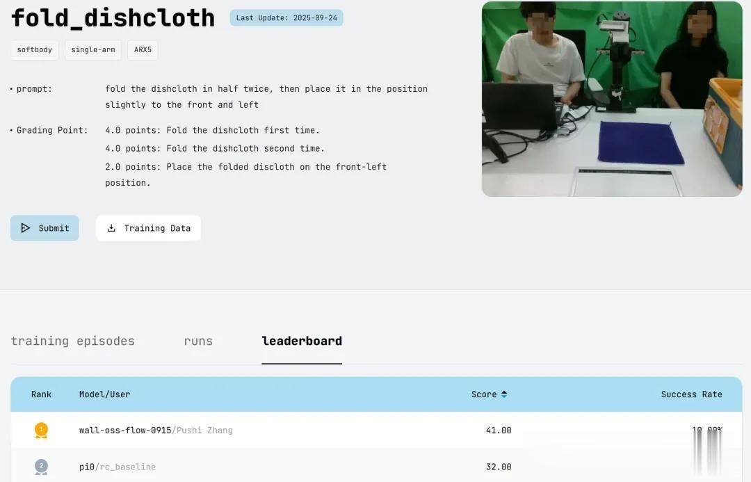 值得一提的是,RoboChallenge的真机测试规则本身并未限制模型进行针对性优化或微调。开发者可以使用官方提供的任务示范数据对模型进行训练。
