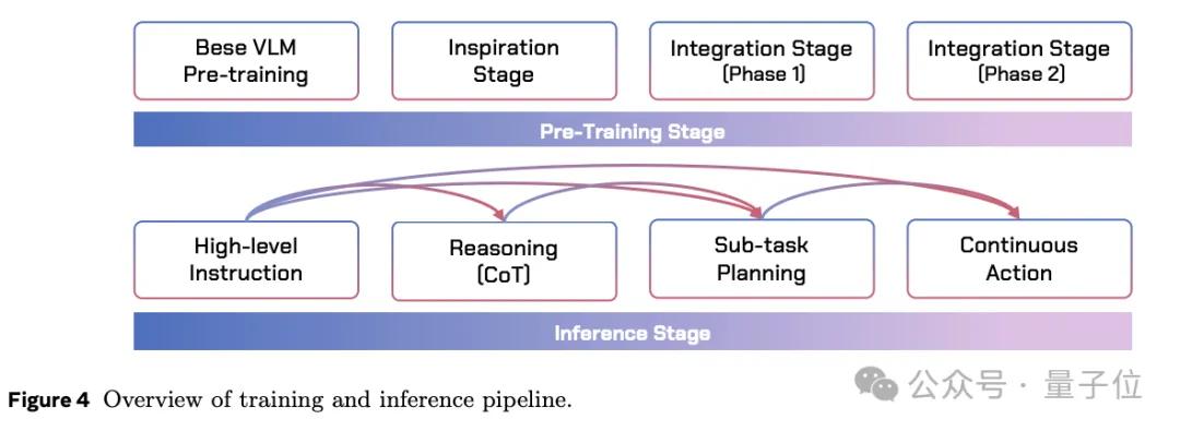 在训练策略上,WALL-OSS设计了“启发阶段(Inspiration)→整合阶段(Integration)”的阶段式范式。