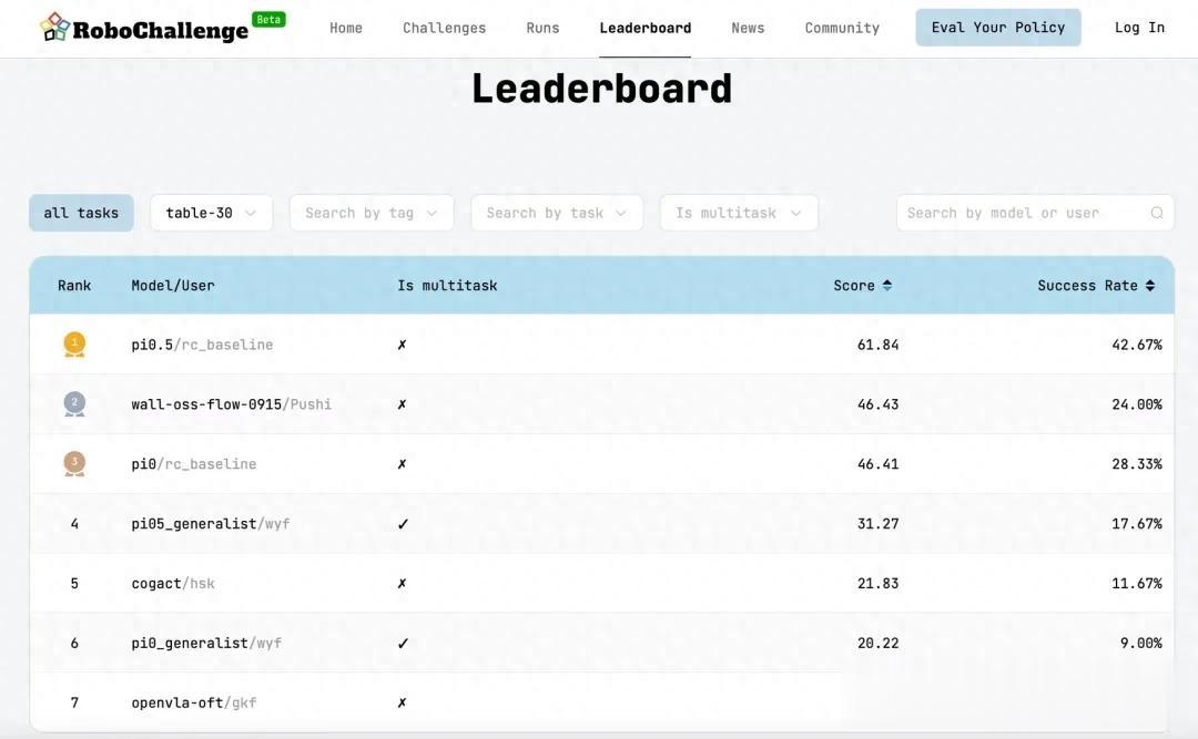 RoboChallenge首发的Table 30任务集,包含30个真实日常操作任务,而在行业常见的真机评测中,任务数量通常只有3–5个。