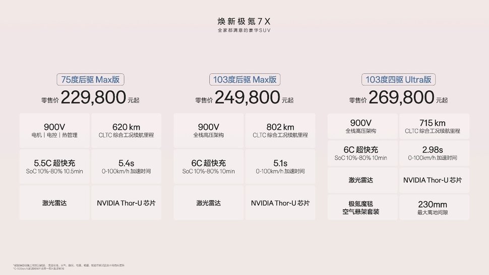 焕新极氪7X在高价值、好口碑的基础上,在空间、性能、安全、智能四大维度豪华进阶,全系搭载900V电机、电控及热管理系统,全系标配5.5C或6C超快充,全系标配激光雷达及算力高达700TOPS的Thor-U辅助驾驶芯片,全系标配137项豪华配置,重塑全球家庭豪华SUV新杆标。