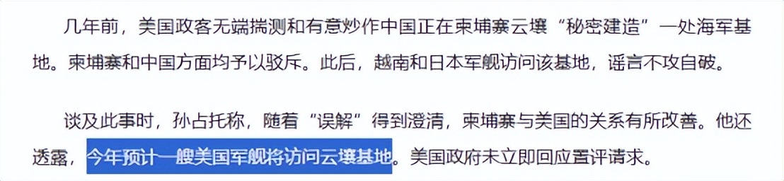 孙占托甚至公开表示,柬埔寨愿意接受美国海军舰艇访问云壤基地,想借此澄清外界关于中国在当地秘密建设军事设施的传闻。