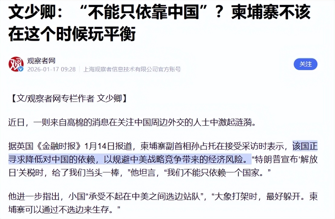 英国《金融时报》1月14日报道,柬埔寨副首相放话,说要减少对中国的依赖,却转头就要去抱美国的大腿。