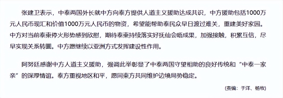 结果这话说完还没过24小时,中国反手给正在和柬埔寨闹别扭的泰国送去了2000万人民币的援助,还点名是给边境受损民众的。